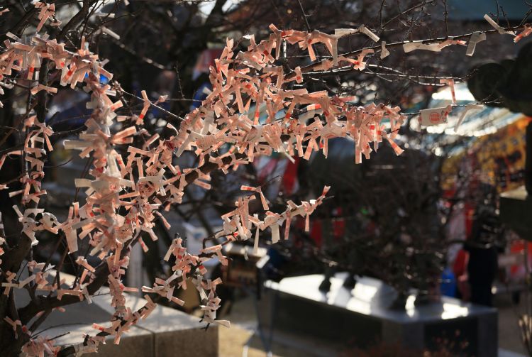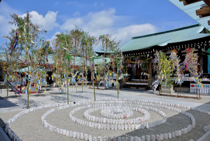 7 月 7 日七夕星祭,挂满彩带并承载着愿望的竹子林立在通往神社的道路两旁