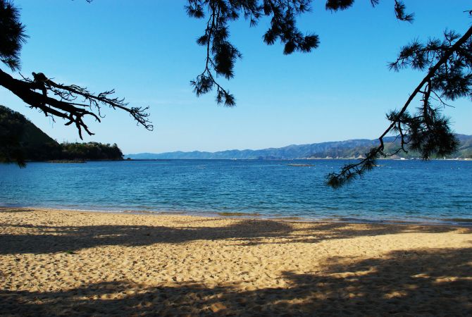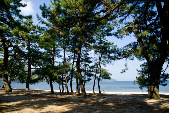 海边的敦贺湾是另一个风景优美的地方;气比松原则是夏天海滩游客最喜欢的地方。拥有约 16,000 棵松树的松树林是日本三大松树林之一,绿树成荫,与蔚蓝的大海和白色的沙滩形成鲜明的对比,如梦似幻,如诗如画。