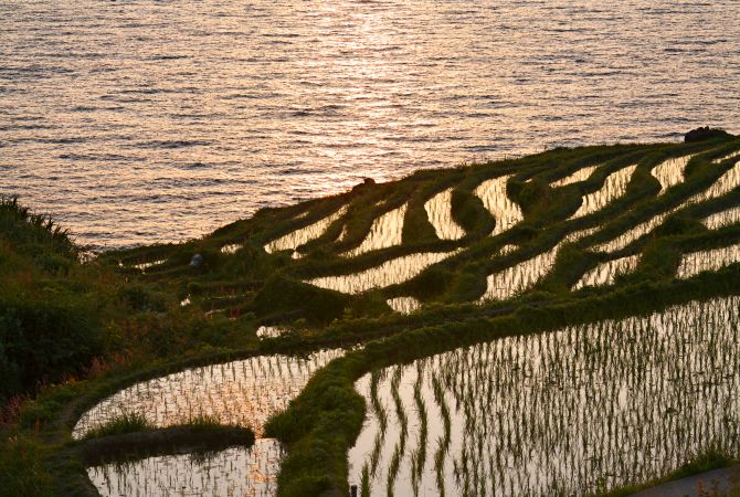 - 黄昏十分,欣赏被灯光照亮的白米千枚田
