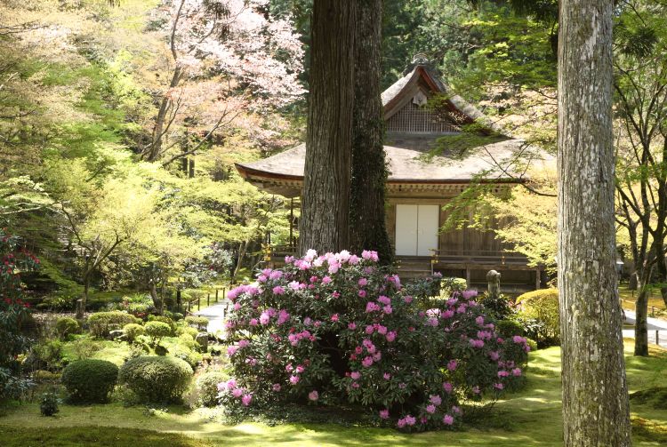 寺庙下面是一座适合散步的庭园,其中有一个池塘、一间茶室、多个石灯笼和小石塔。这个庭园以秋天盛开的樱花而闻名,它为游客提供了同时观赏樱花和秋叶的独特机会。