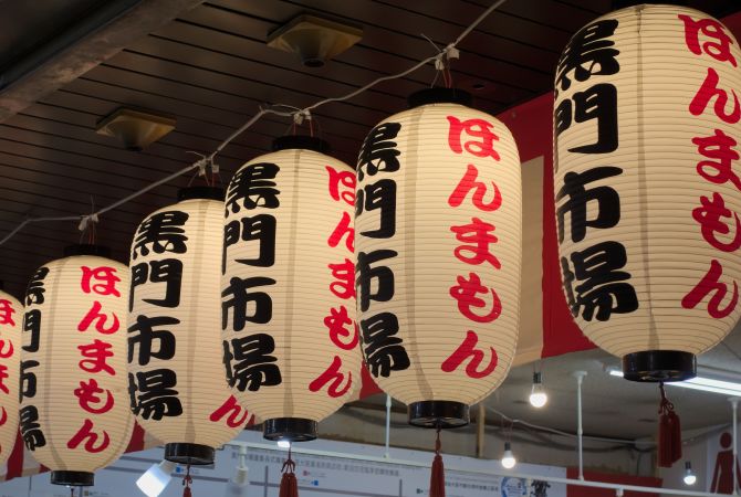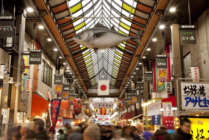 前往约有 200 年历史的黑门市场,在这座传统市场里挑选现场展示的丰富渔产和其它农产品。日本鱼贩做生意很有自己的一套,首先会自信地介绍自己的渔产,再极力劝说顾客购买。在以直爽著称的大阪,此种销售风格更为明显。