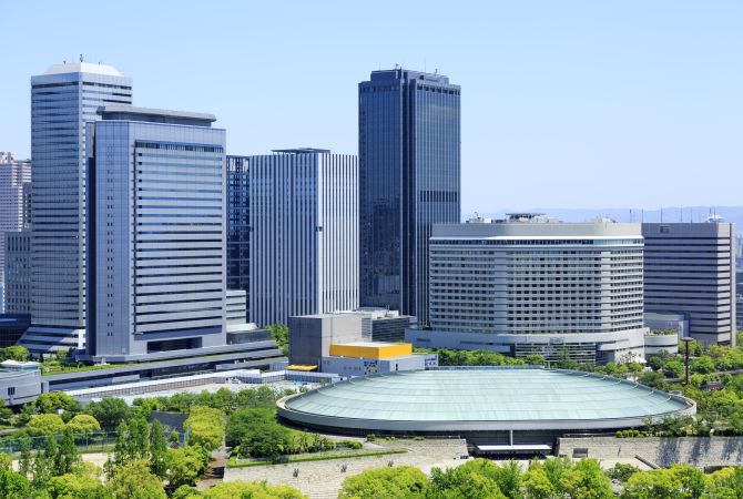 大阪城北部可见的摩天大楼一带隶属于京桥商业区。夜间可以来街头走走,领略梅田商业区更加朴实的别样街景。街头酒吧和餐厅比比皆是,用餐时可以看到许多白领,经过一天的漫长工作后,他们松开了领带,卷起了袖子,大快朵颐。
