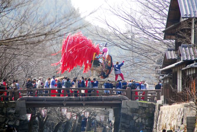左义长祭被认为是日本最危险的祭典之一。该祭典于三月中旬举行,期间会有一场激烈的竞赛,在众多巨大的左义长花车中挑选出最好的一个。这些花车均采用稻草、竹子和纸精心制作而成。