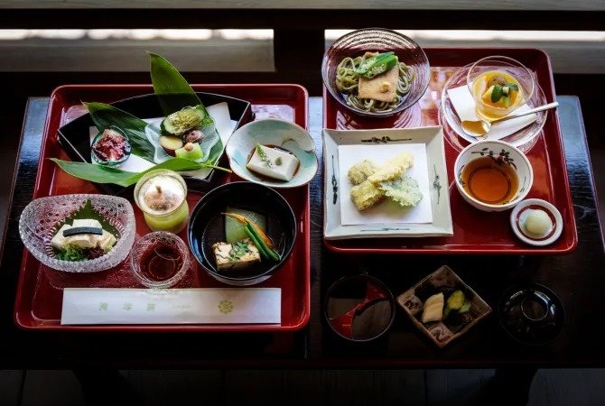 精进料理仅以蔬菜和野菜为食材,巧妙地根据季节变化调整菜肴,提供有益身心的美食。这种佛教素食料理着重于展现各种食材的本味。宿坊为过夜的游客提供精进料理,但这座佛教城镇里的部分餐馆也会供应佛教午餐。