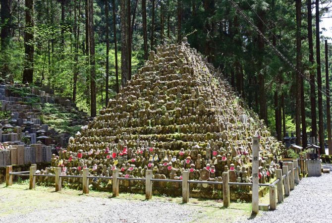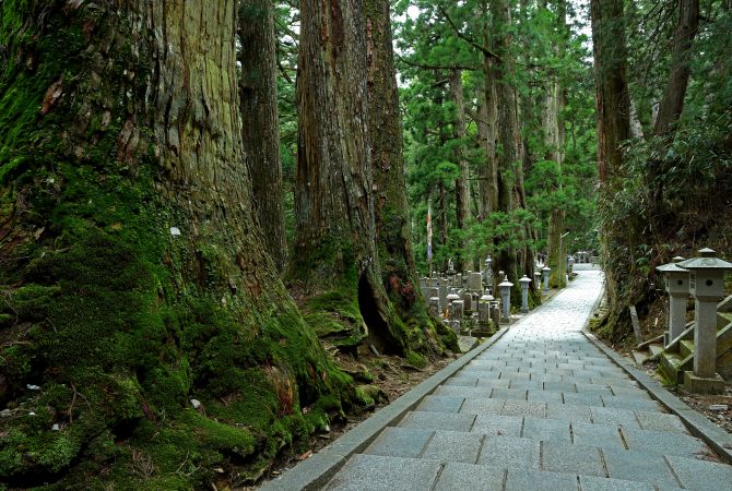 在古老雪松的绿荫之下,通往奥之院的鹅卵石小径两旁有超过 200,000 万个覆满青苔的墓碑与纪念碑。知名历史人物、伟大武士与贵族的墓碑与现代工商业杰出人物的墓碑比邻而立。