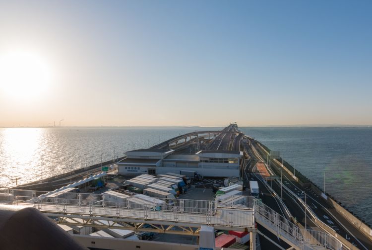 海萤火虫停车区是一个人工岛,也是东京湾跨海公路的中转站。人工岛名为"海上萤火虫",四面环海,休息站配备餐厅、商店和其他设施,是欣赏海湾景色的好地方。