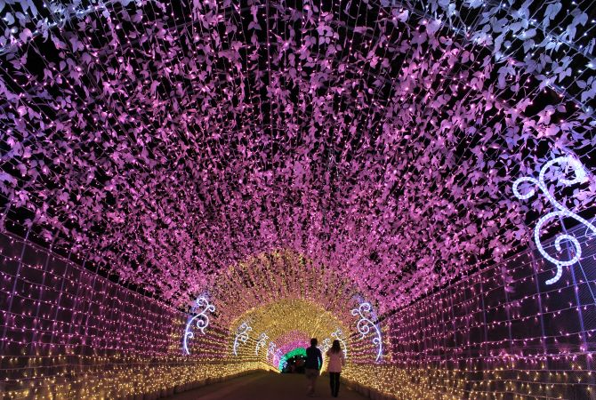 坐落在横滨西部的是相模湖度假村----Pleasure Forest,在这里,您可以在一年一度的相模湖灯光秀上欣赏奢华璀璨的冬季灯光,活动从十一月持续到次年四月。在绚烂多彩的展览区漫步,尽情欣赏将近 600 万只照亮公园的 LED 灯。
