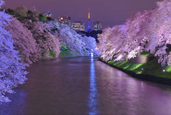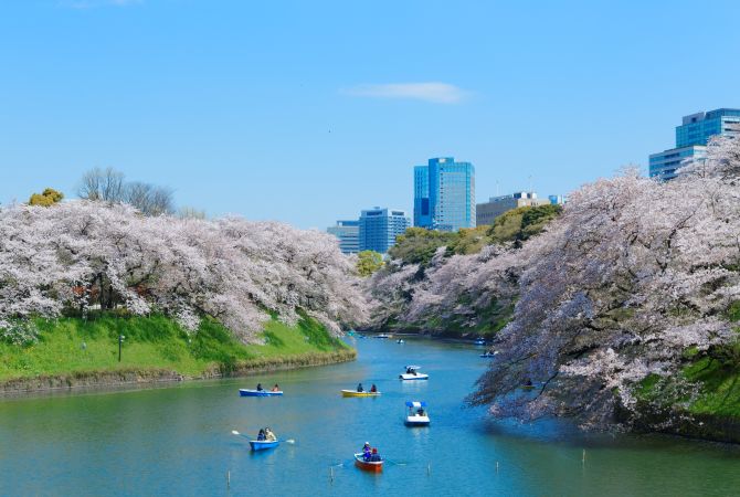 在春天的樱花季,在皇居庭院内散步十分宜人,千鸟渊在精致的粉红色和白色衬托下,显得生机盎然。从九段下站走一小段路,就可以漫步在漫天樱花的树荫下,甚至可以租借小船,沿着美丽的护城河中泛行。务必早到以避开人潮。
