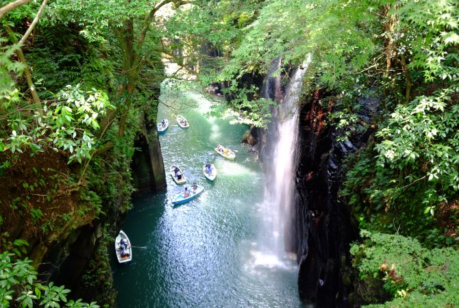 高千穗峡以澄净透亮的山泉闻名,这也是当地的骄傲。高千穗峡因大约 100,000 年前附近的火山活动而形成。游客可以搭乘小船穿越峡谷,近距离欣赏真名井瀑布自断崖倾泻而下的壮观景象,或沿着峡谷旁铺设的道路从上方欣赏高千穗峡如诗如画的风景。