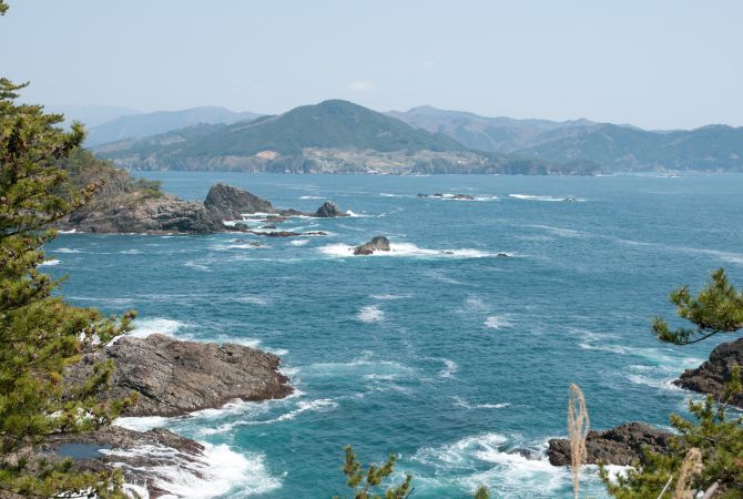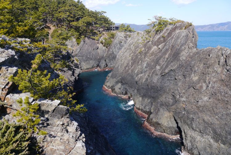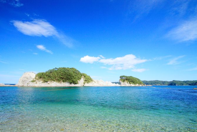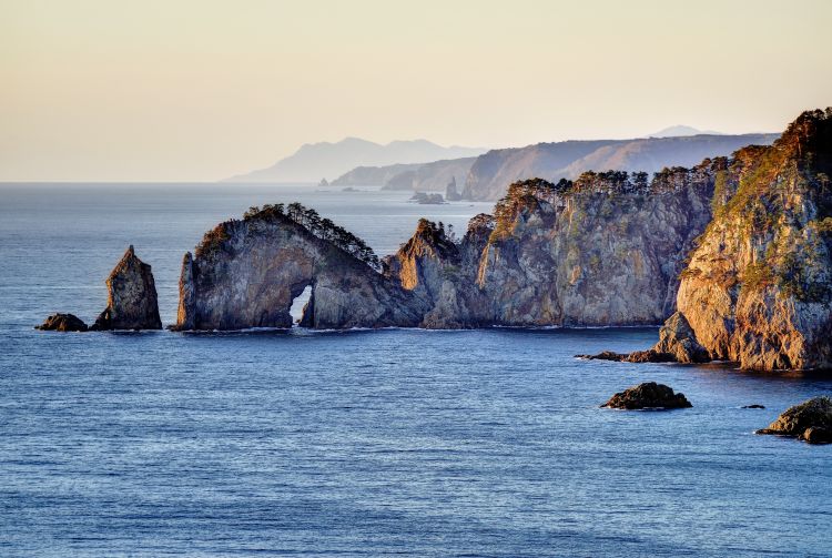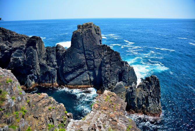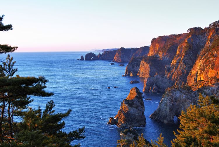 岩手海岸以独特的岩层闻名。在田野畑村的北山崎,200 米高的鹈之巢断崖耸立于海面之上,岩层的独特之美在此展露无遗。北山崎有许多小径供您漫步,您也可乘船游览,从海上观赏悬崖峭壁。