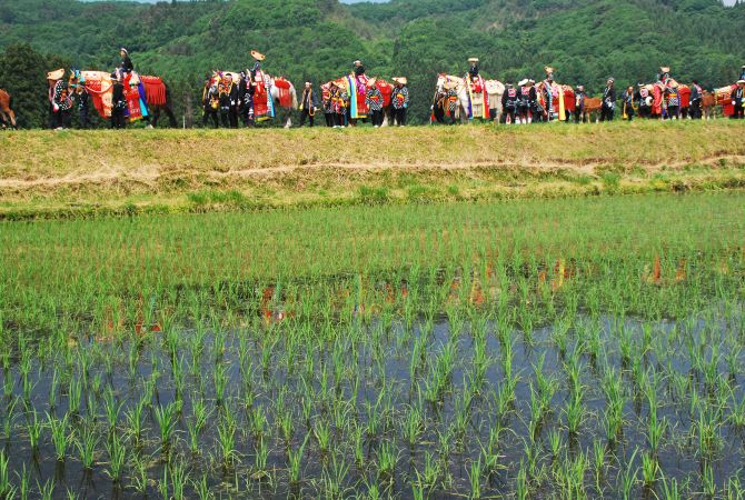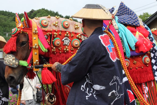 在叮铃叮铃赶马会上,马儿们身着盛装,挂着数百个铃铛,从泷泽市一直游行至盛冈,全程 15 公里。期间马儿会休息两次,这时候您可以接近它们,给它们喂食,与它们合照。
