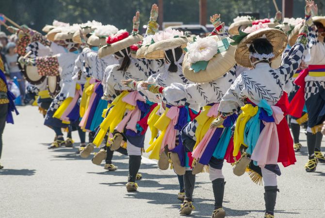 另一盛大活动是日本秋祭。装饰华丽的花车载着太鼓鼓手和舞者在城市的大街小巷穿行。最后一天是骑射活动。人们认为,击中靶心便寓意着丰收、和平与安全。