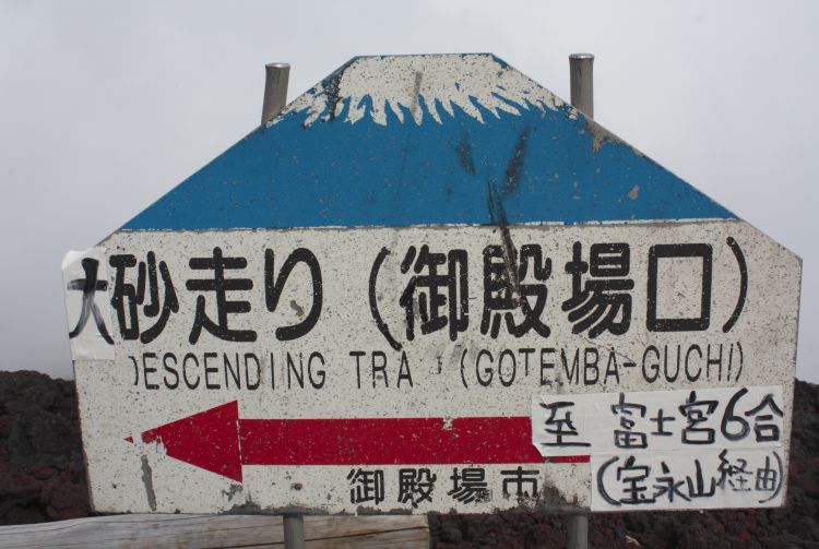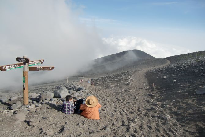 下山时,有一部分路线和登山路线重叠,最后会分岔来到大砂走坡,或大家所谓的"大型砂子滑走步道"。顾名思义,您可以在这里加快速度,而且有一大段路能相对轻松地下山。在这段路上,由于会有大量细小尘土,因此请务必要使用护腿或绑腿,出于同样原因,您或许也会想戴上口罩或护目镜。雾气会迅速飘来,因此请小心别距离路标太远,以免迷路。