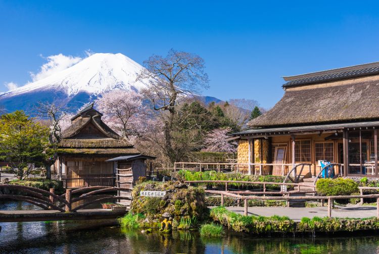 游览位于富士山北边忍野八海涌泉群的八个池塘,欣赏在茅草屋村落、水车与装饰性桥梁点缀下的绝美富士山景。
