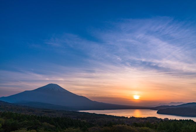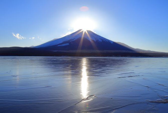 在十月下旬到次年二月下旬,当正在升起或落下的太阳与富士山顶对齐时,就会出现"钻石富士"奇观