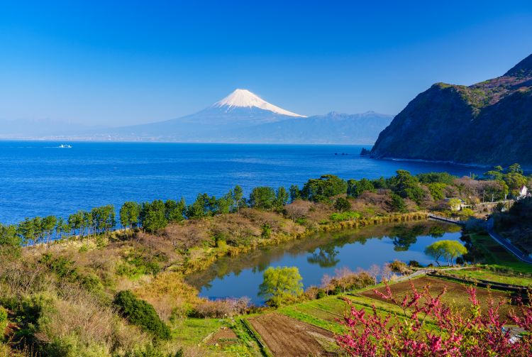 西伊豆的海岸线沿着伊豆半岛的西岸蜿蜒分布,游客能在田园景色中欣赏富士山。西伊豆的北边是堂岛温泉,这里是少数几个能让人一边泡汤,一边隔着骏河湾欣赏富士山的地方。