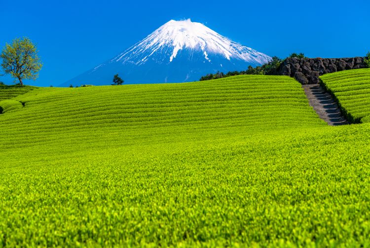 静冈的富士市距离富士山仅 30 公里,以其品质绝佳的绿茶而闻名。青翠嫩绿的茶园与高耸山峰的背景形成鲜明对比。趁着五月时造访,可见最翠绿、尚未经过摘采的茶树嫩叶。