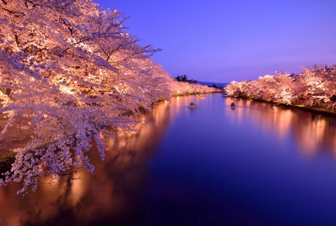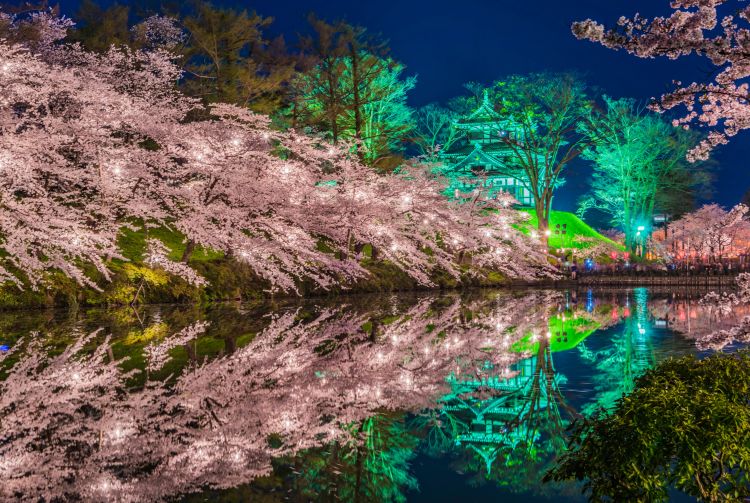 新潟的高田城址公园和青森的弘前公园均是观赏夜樱的胜地。设计团队花了相当多的心思,巧用灯光,照亮大片的樱花树,营造出令人赞叹的效果。高田公园最著名的当属宽阔的庭园和如梦似幻的樱花隧道。高田城址公园的赏樱期从四月初持续到四月中旬,弘前公园则在四月底。