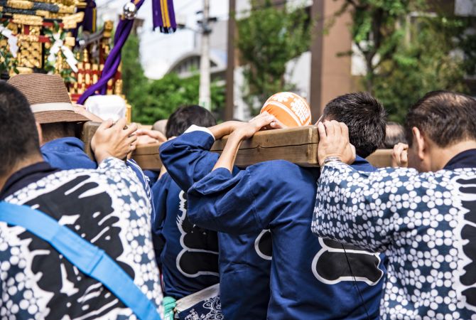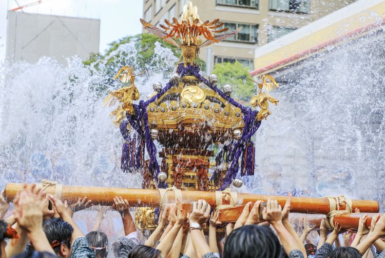 许多祭典会使用神舆,亦即神轿。实际上就是迷你的移动神社。参拜者会载着自己社区神社的神明,沿着邻里四处游行。在有些祭典中,游行会平稳而流畅地进行,有些则会将神舆前后摇晃,藉以取悦神明。