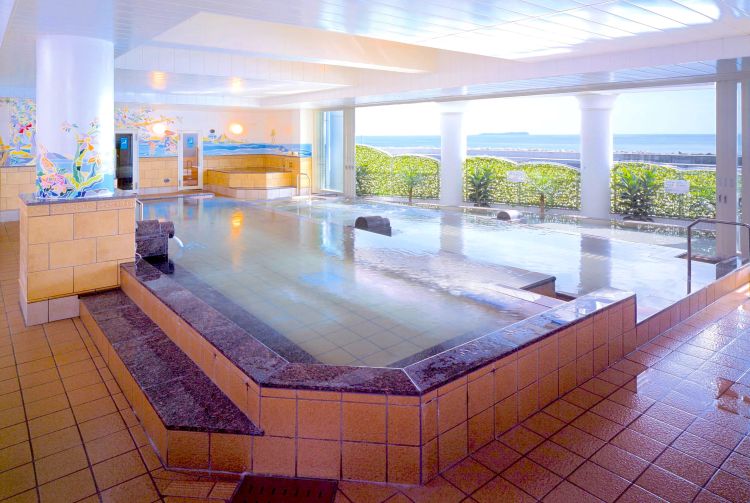 在静冈宁静东岸的伊东市,有一个道路休息站,设有令人舒缓的海边水疗中心,您可以在这里尽情享受水疗,欣赏太平洋令人屏息的美景。
