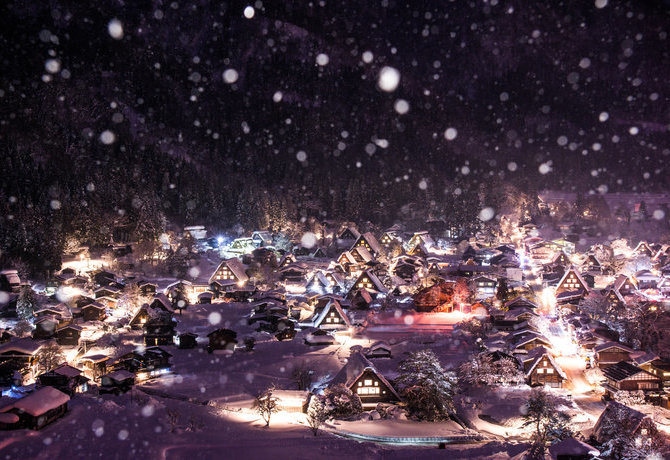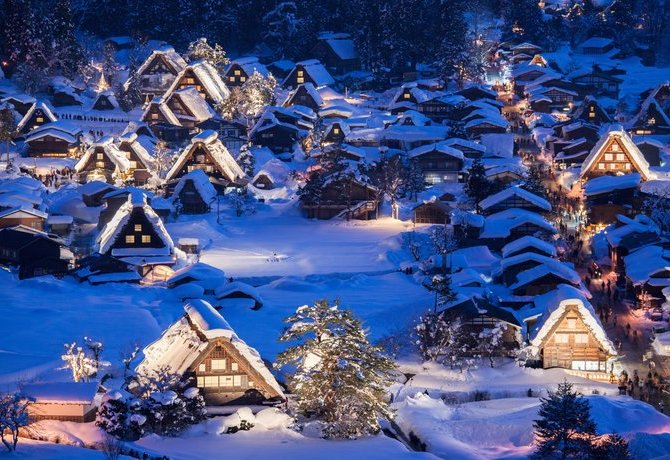 这个美丽的世界遗产村隐藏在偏远山区里,远离现代世界。为了保护住户不受积雪影响,这些房舍皆采用了此地的代表性设计风格——合掌造,有着陡峭的茅草屋顶,而且许多房舍已有 250 多年的历史。冬日的夜晚,房舍被白雪覆盖,村庄内灯光点点,如梦似幻。别忘了从荻町展望台欣赏这些房舍的全景。部分房舍也提供住宿。