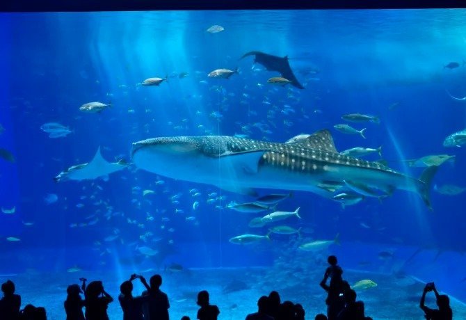 冲绳美丽海水族馆坐落在国营冲绳纪念公园内,有 大约 680 种的约 10,000 条鱼。在巨大的主水族箱里,您可以欣赏到鲸鲨、蝠鲼以及数不尽的其它鱼类。水族馆的营业时间是上午 8 点 30 分到下午 6 点 30 分。请务必预留出几个小时,以便观赏完整座水族馆。