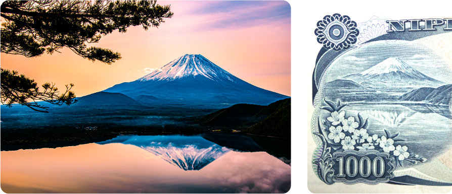 在中之仓山道观景台欣赏富士山美景。(左)1000日元纸钞背面图像。(右)