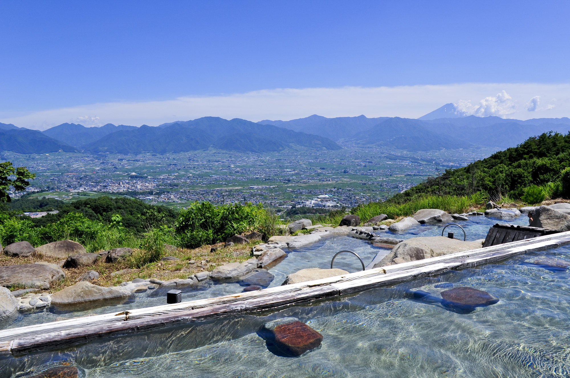 自 Hottarakashi 温泉的露天浴场可欣赏富士山的壮丽美景。
