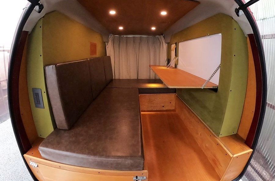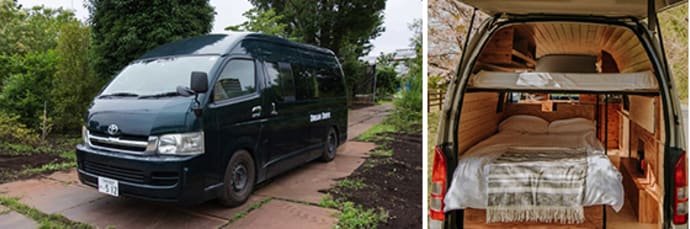Hiace总长5.8 码(左)。Hiace 后侧配置有占据车厢四分之三空间的加大床铺(右)。图片来源:Carstay Co., Ltd.