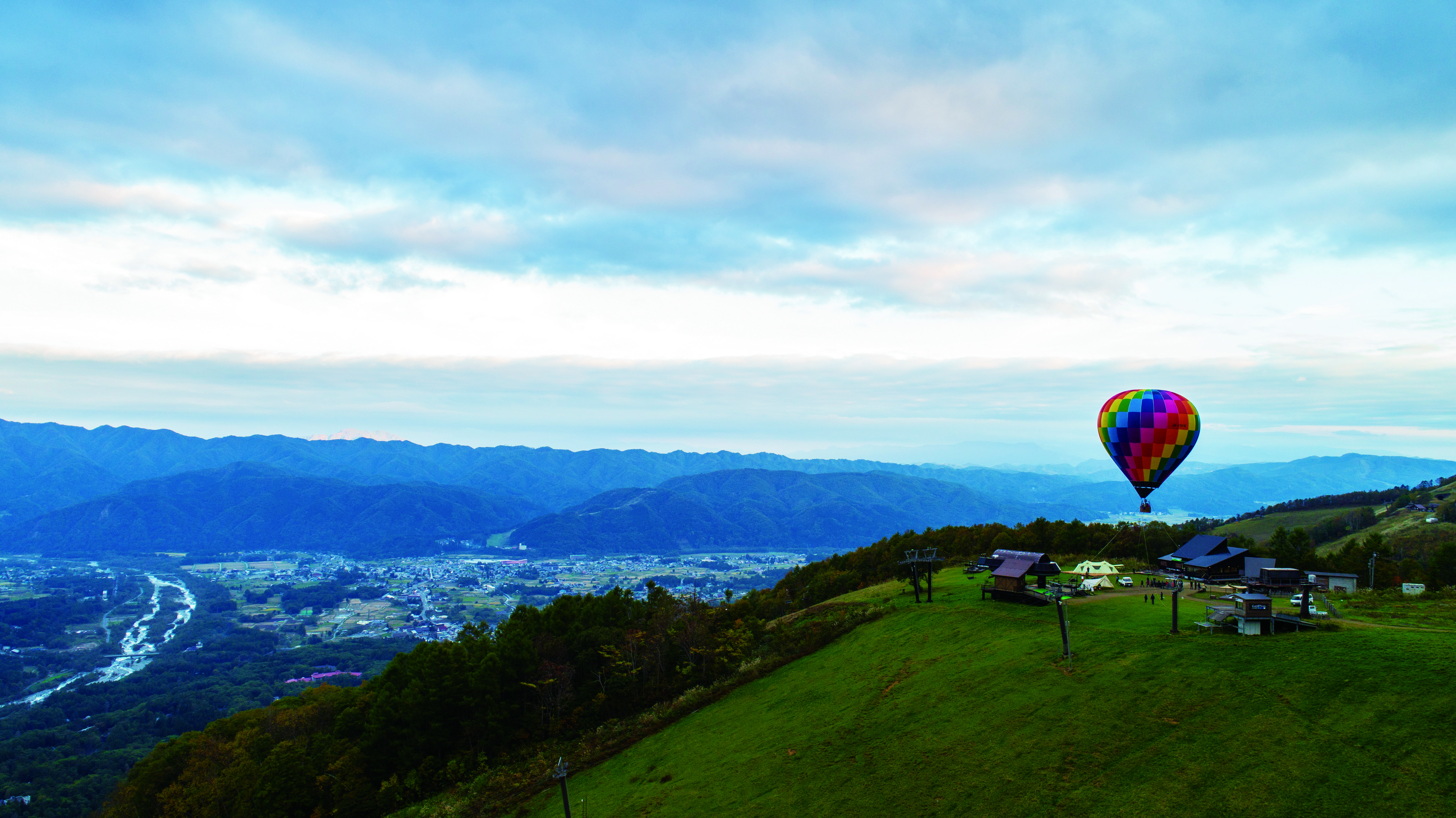 白马度假村有七类帐篷款型可供选择。(左)热气球体验。(右)2张图片来源: Snow Peak FIELD SUITE HAKUBA KITAONE KOGEN