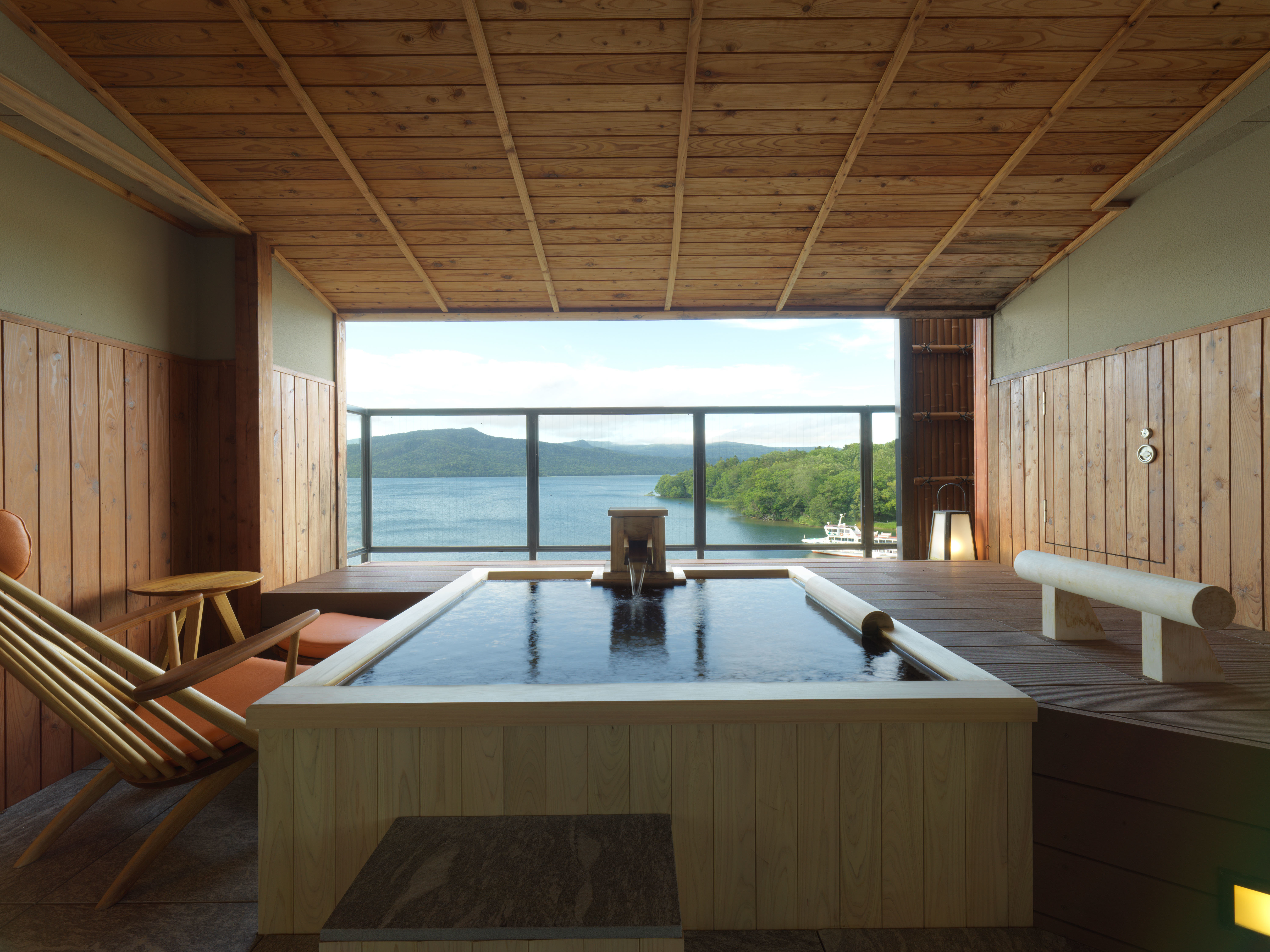 特別套房 Ama no Za Suite 天之座配置有柏木浴池,可在享受温泉时远眺阿寒湖的迷人景致。Photo credit: Akan Tsuruga Bessou HINANOZA