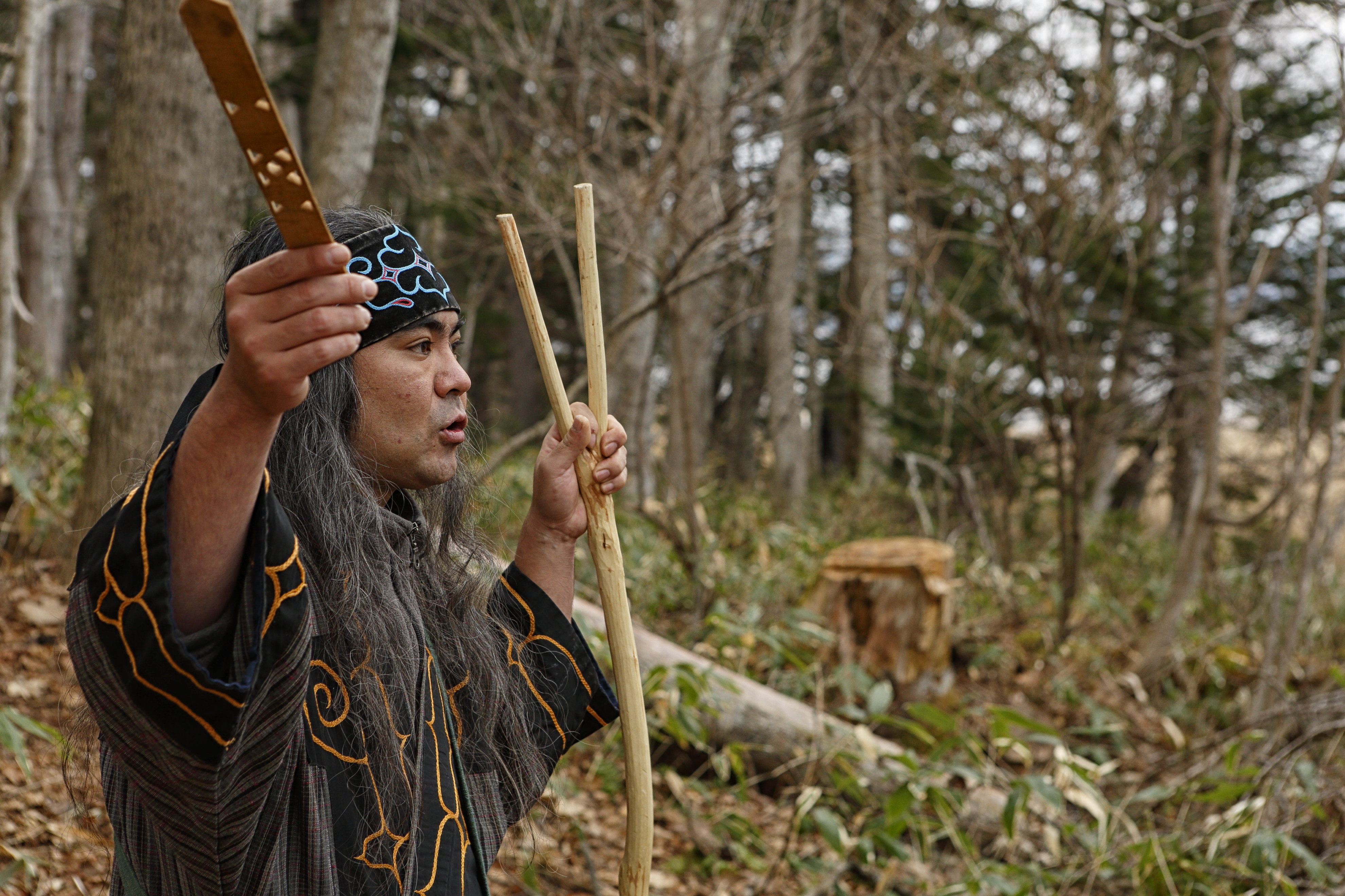 爱努族导游泷口健吾先生右手持有祭祀用具 ikupasuy。