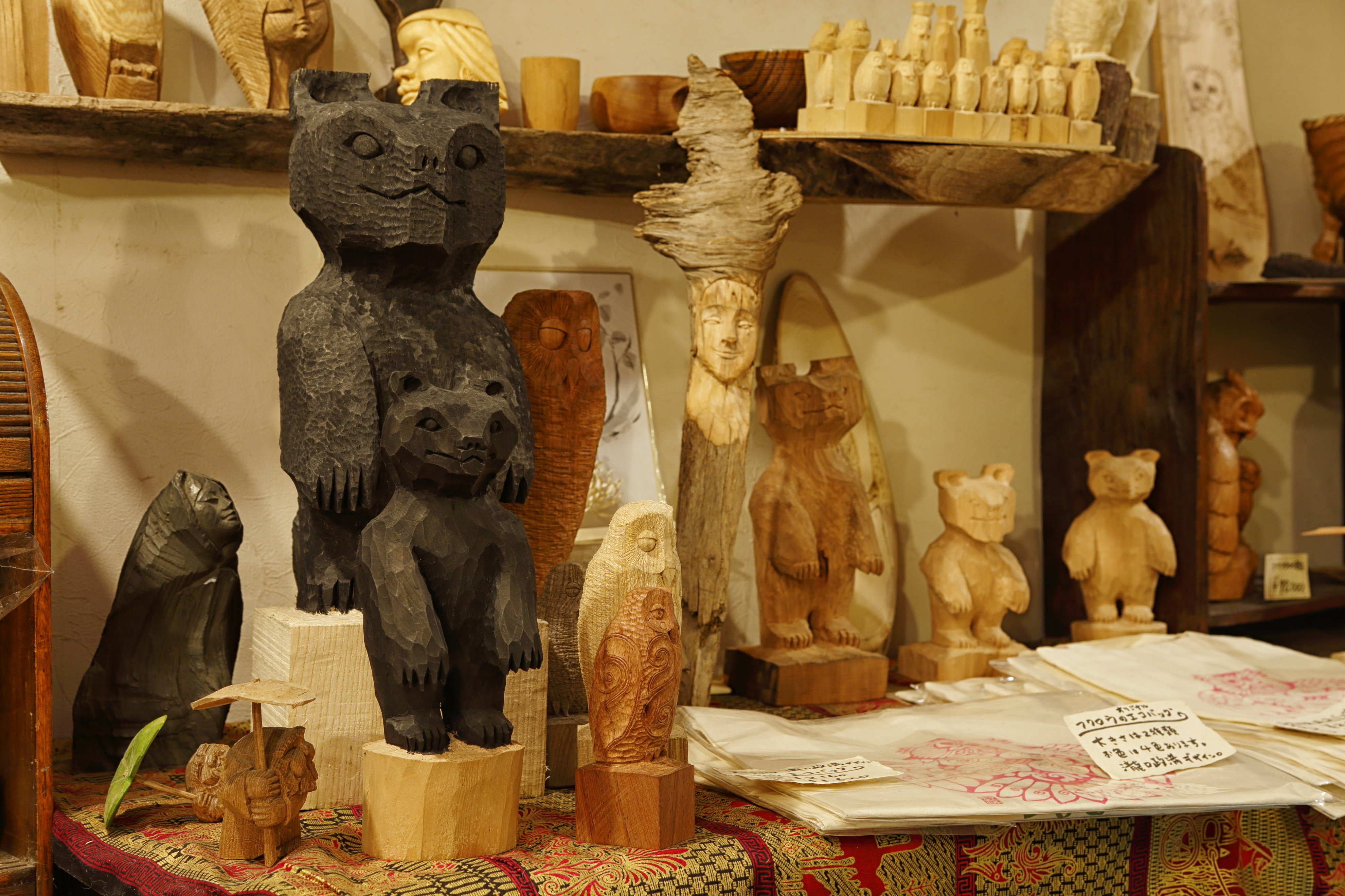 泷口健吾先生亦是一位木雕艺术家,他是“Anytime, Ainutime!”手工木雕体验的讲师。旅客可在一旁参观雕刻过程,亦可在阿寒湖爱努柯坛的商店 ICHINGE的店中进行购买他的作品。