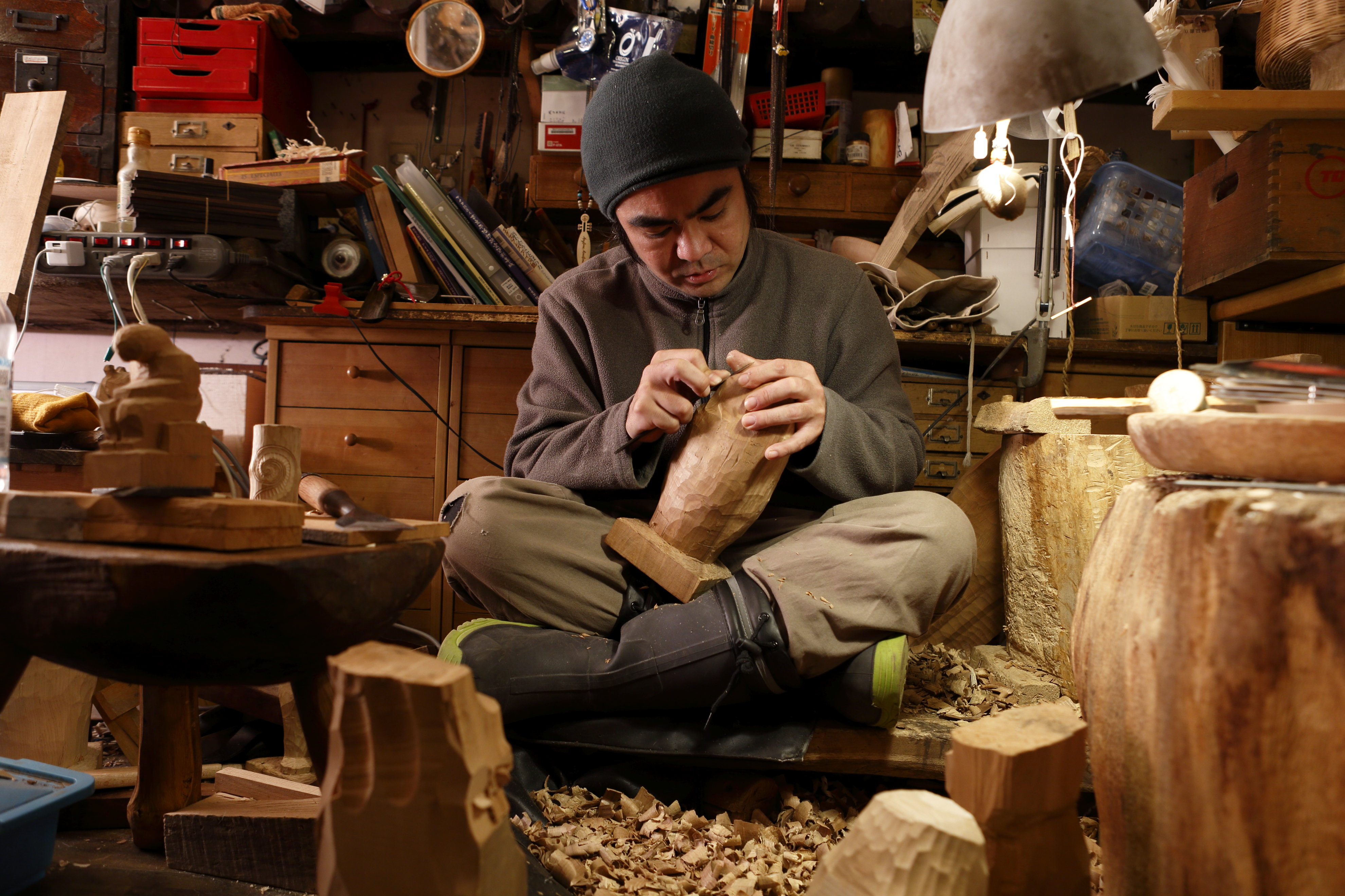 泷口健吾先生在商店 ICHINGE的店内雕刻艺术品。他的父亲是一位著名的雕刻家,他继承了从父亲的手中继承了这家商店。