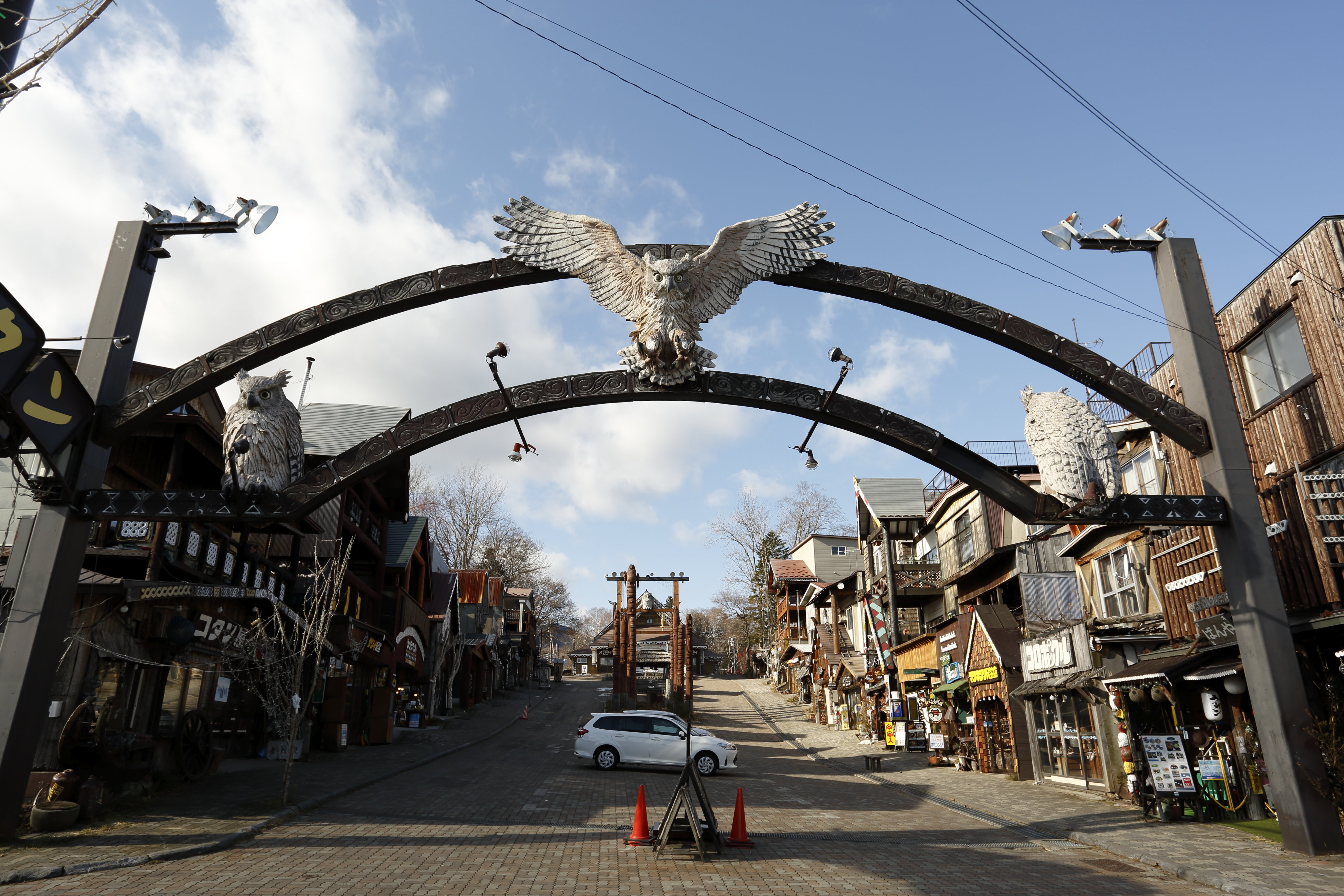 阿寒湖爱努柯坛的街道两旁林立各式餐厅以及贩卖爱努手工艺品的商店。