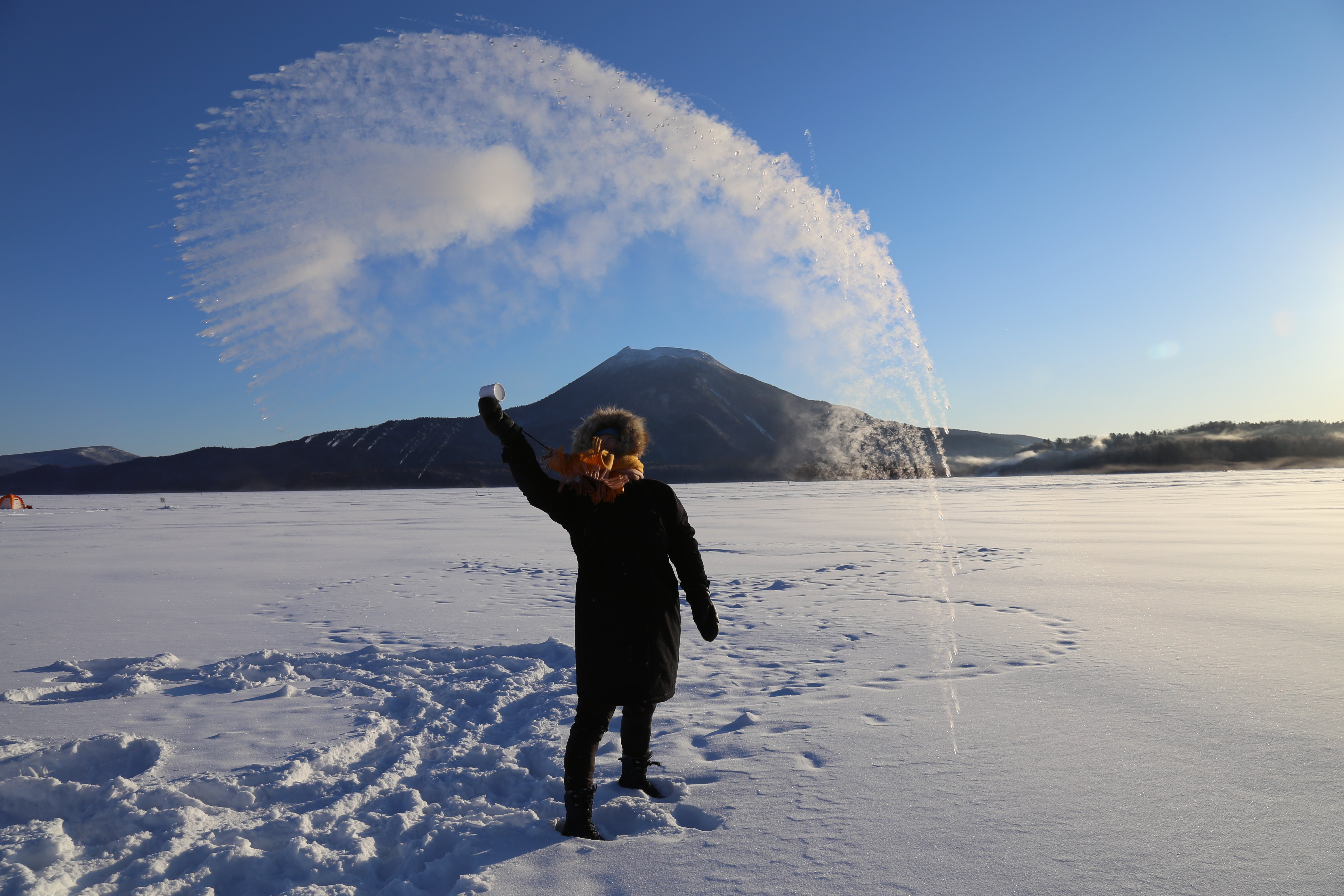 冬季的清晨,阿寒湖面极为寒冷,将热水抛洒至空中,液体便可在瞬间蒸发为水雾。Photo credit: Tsuruga Adventure Base SIRI