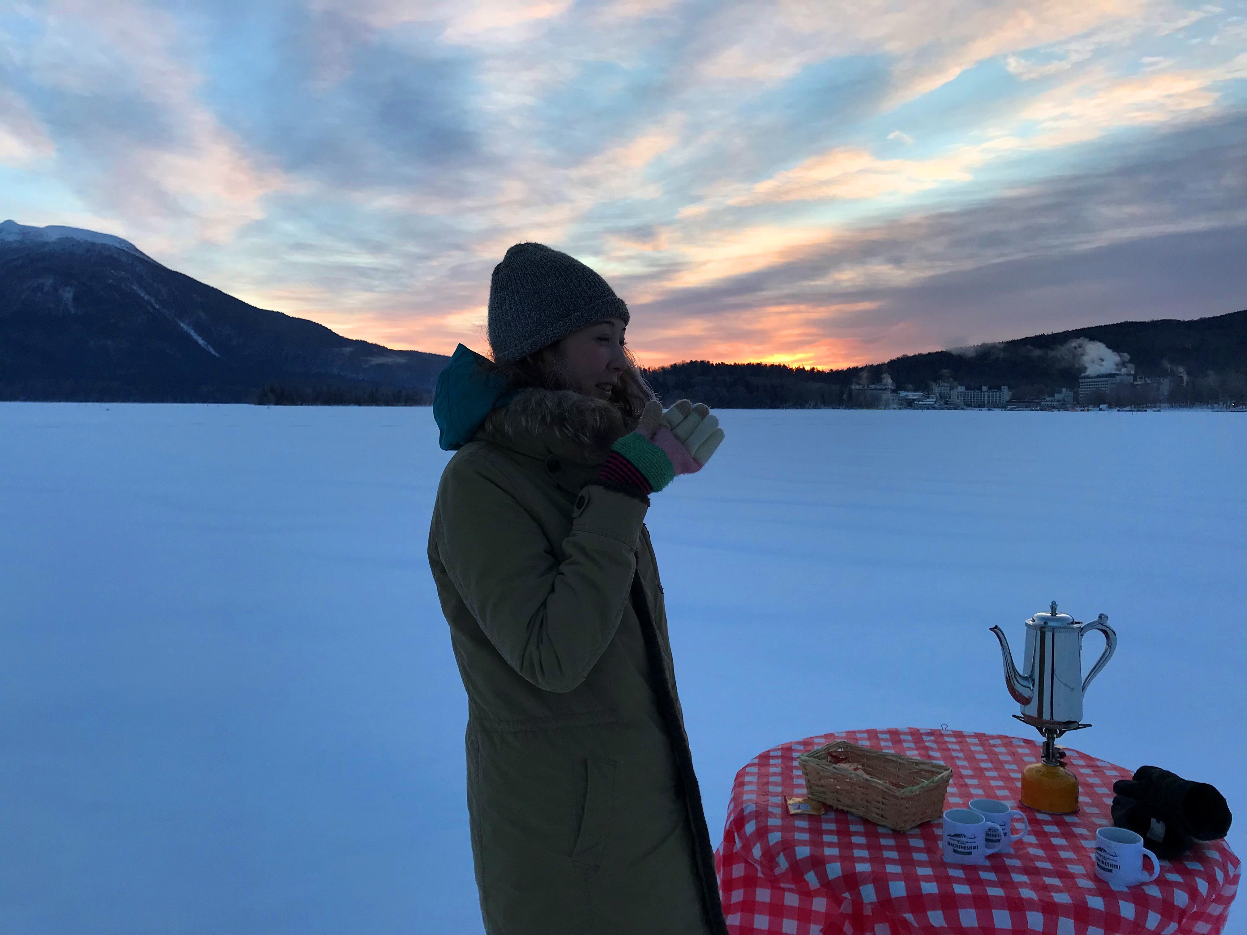 于冰冻的阿寒湖面品味啜饮热气腾腾的晨间咖啡可谓令人难忘的冬季体验。Photo credit: Tsuruga Adventure Base SIRI