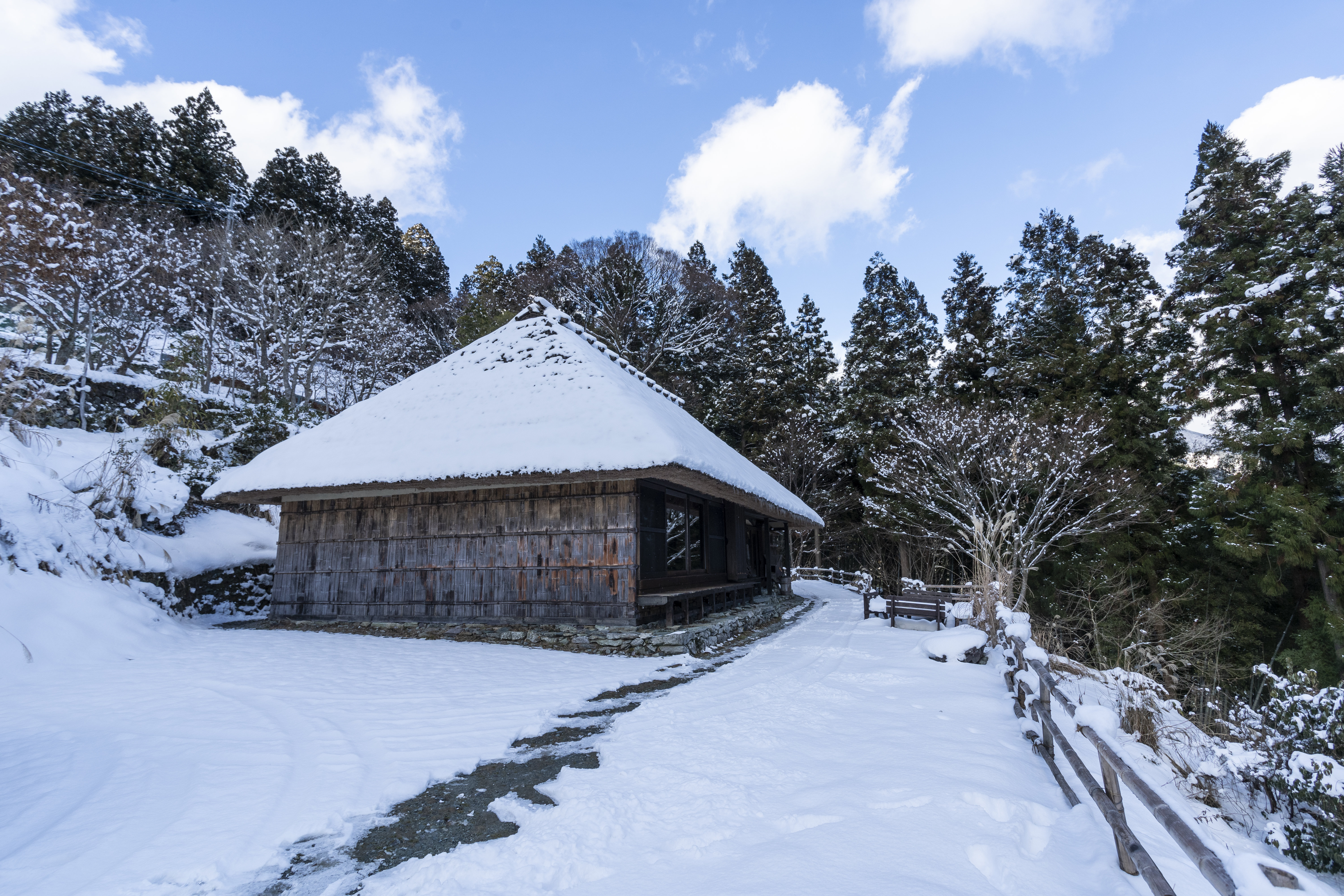 乘坐出租车前往“篪庵”,(也可从大步危站乘坐巴士)。车辆深深驶入四国山脉独特的险峻山路,可以看到覆盖山体的森林正在被雪染白。约50分钟后,攀上勉强可供一辆车行进的小路,就达到了目的地。