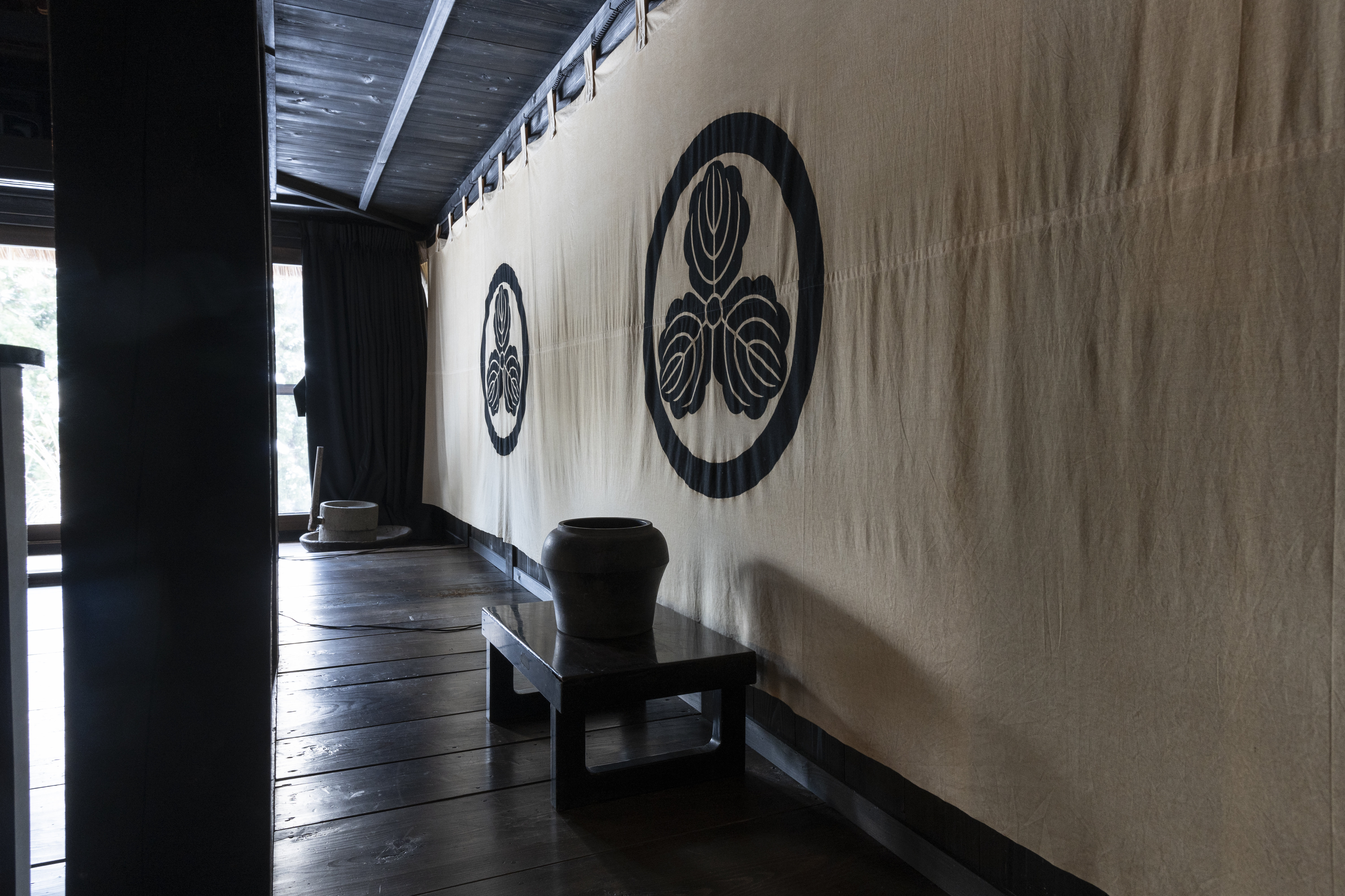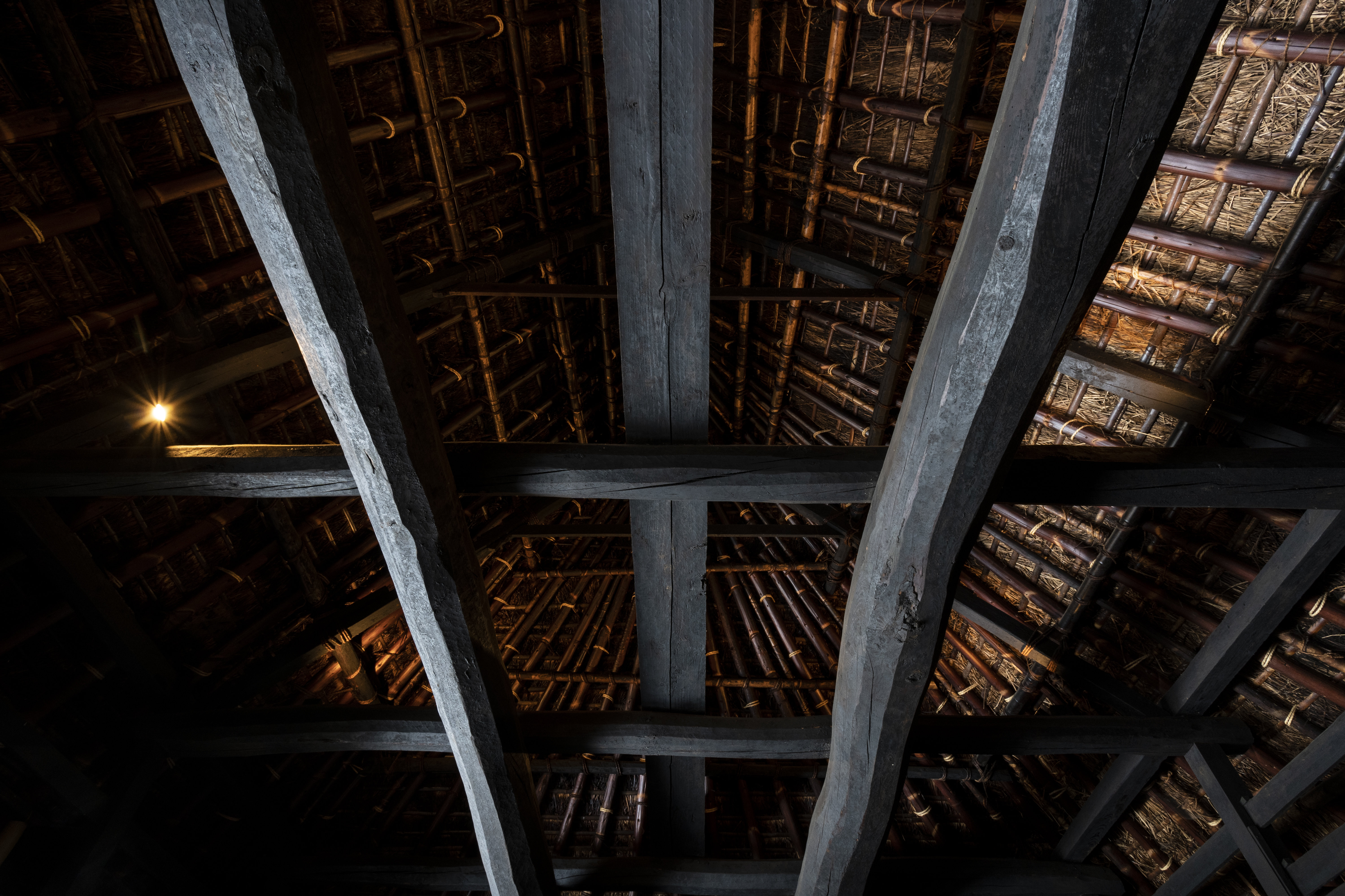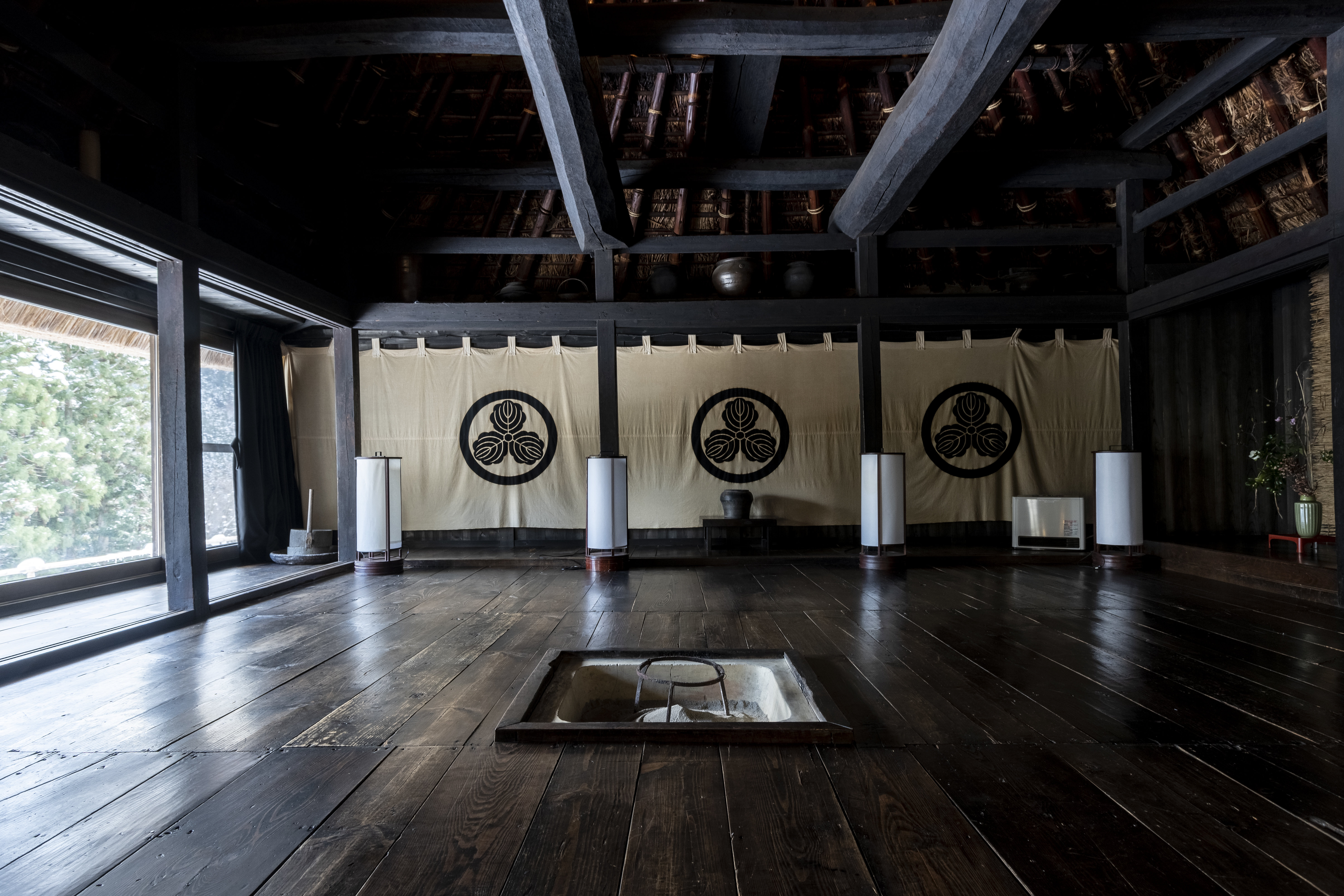 打开纸拉门,眼前展开的空间洋溢着厚重的历史气息,很难与日本房屋的和室联系在一起。300年前的地板和漆黑的大梁与横梁,散发着幽暗庄严的氛围。比起用代表日本古民宅的砖瓦屋顶与格窗等装饰来体现文明的房屋,眼前的景色更能使人仿佛回到远古的生活。