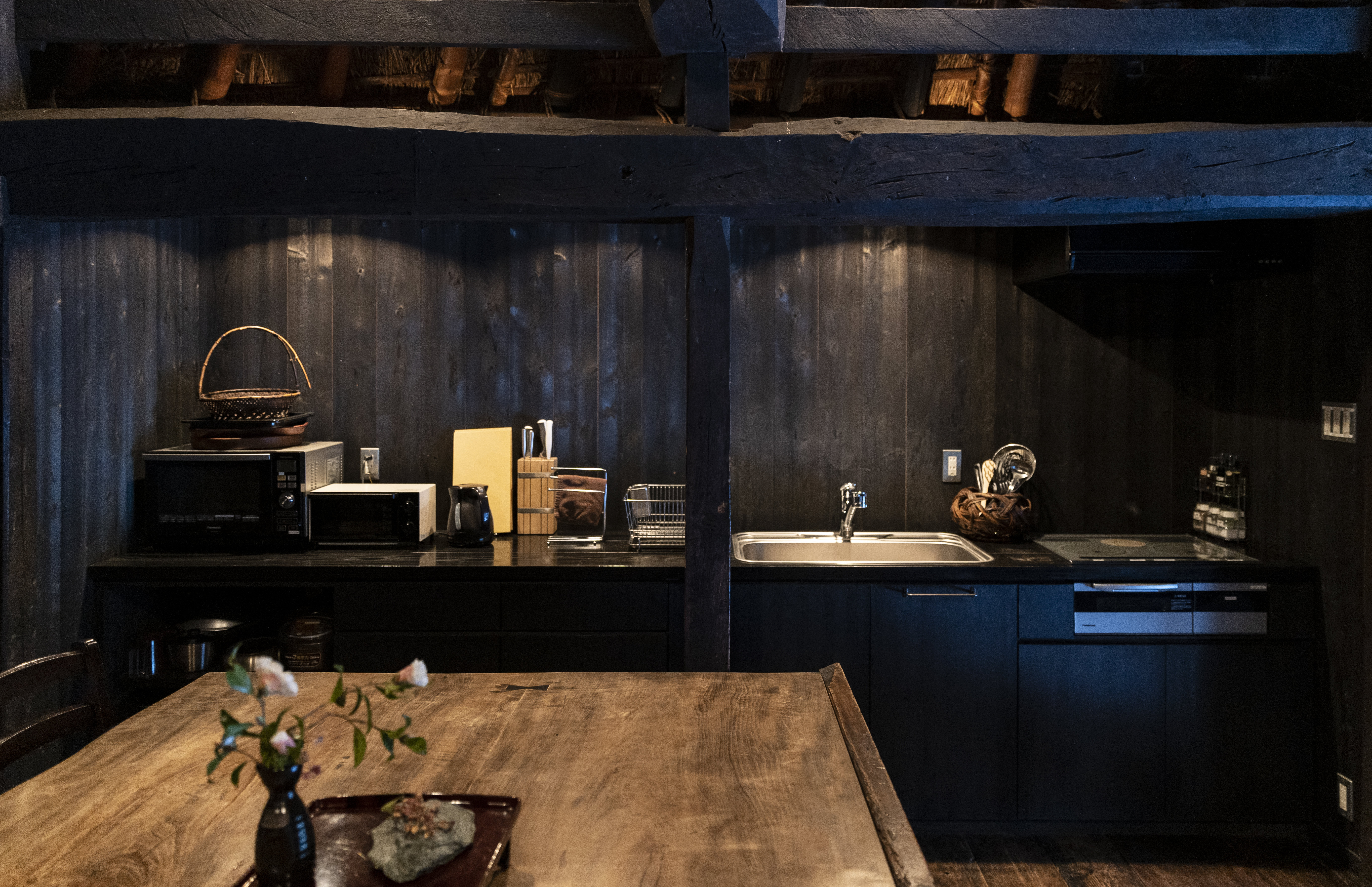 抬头能看到高耸裸露的屋顶,仿佛哥特建筑的大寺院一般,打造出开放感十足的空间。 企划了古民宅的亚历克斯先生说:“在‘篪庵’,最重要的是要感受这个家所拥有的能量。”
