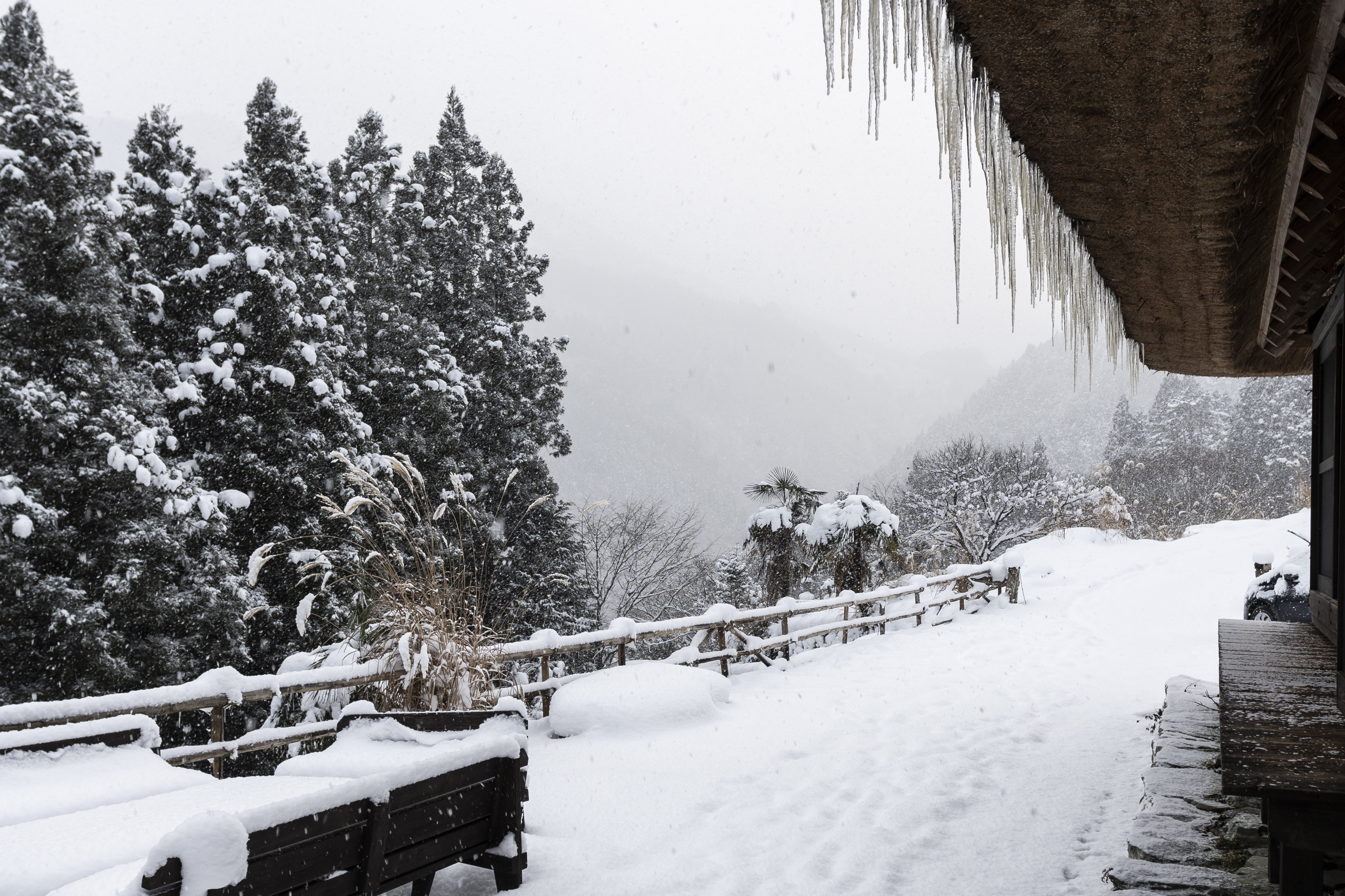 我醒来时是次日清晨6点。用昨天剩下的食材做了简单的早餐。饭后眺望窗外,发现天气与昨天截然不同,下起了大雪。茅草屋顶下垂着冰柱。这个地区从12月末至次年2月都在下雪,但只有几天会下暴雪。之后我听说,这一天的雪是本季最大的一场雪。隆冬特有的非日常体验也是去地方旅游的乐趣之一。