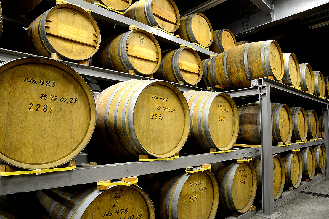 本地酿造的日本盛若 (Moriwaka)烧酒,精心储藏在神津岛酒藏 (Kozushima Sake Brewery)中。图片来源:神津岛酒藏 (Kozushima Sake Brewery)