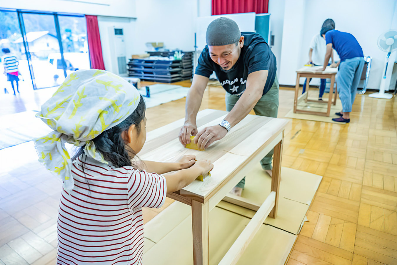林业倡议运动“东京电锯”打造了一个亲子工作坊,让孩子们能够亲身体验砍伐树木的过程,然后用现场提供的木材制作自己的书桌。图片来源:东京电锯(Tokyo Chainsaws)