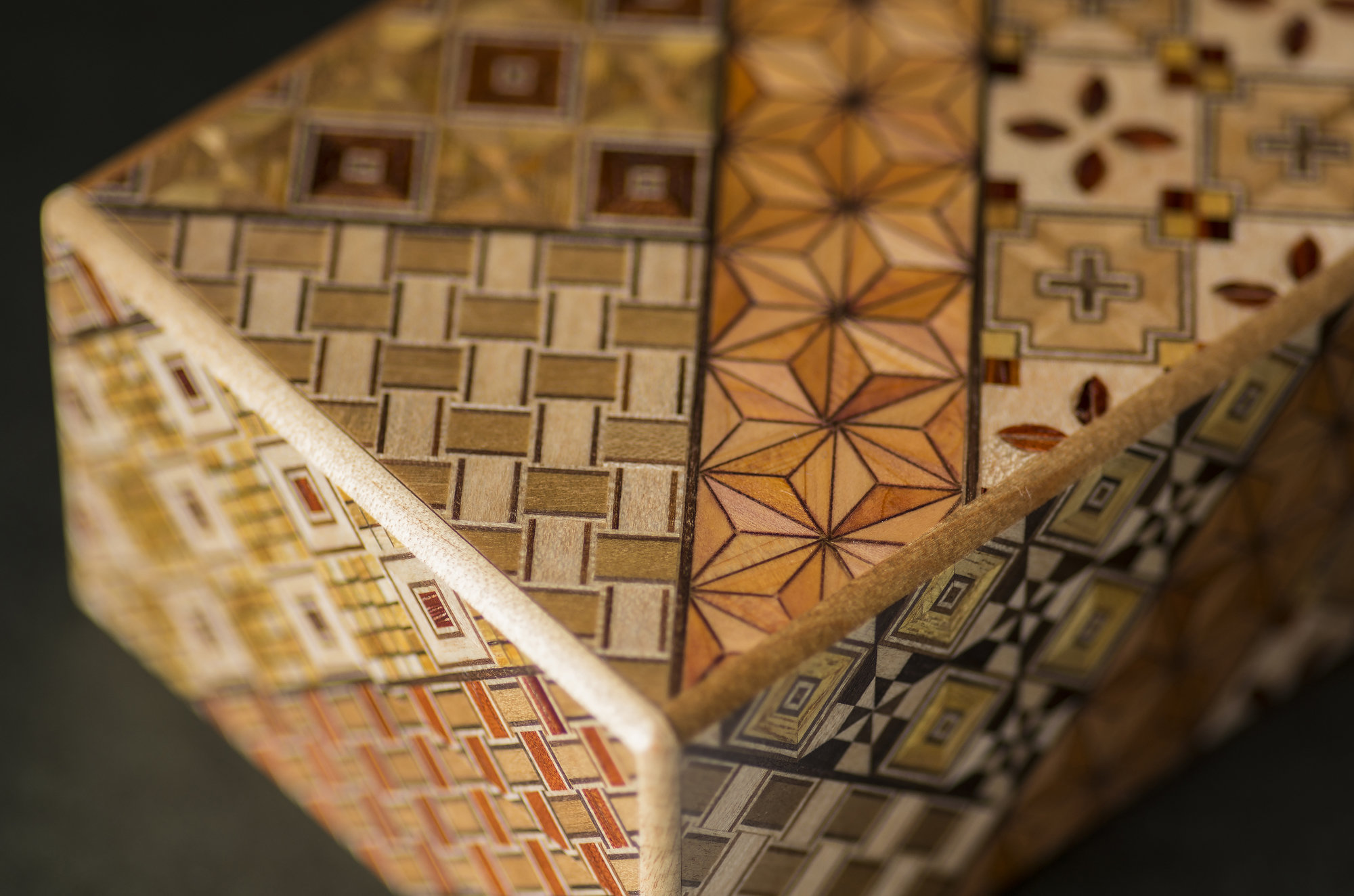最著名的寄木细工工艺品当属构思巧妙的日本“迷箱”(himitsu-bako),这些木质盒子看似普通,但往往却需要绞尽脑汁,才能正确的通过移动盒子上的表面来解开谜题。开启木盒所需的步骤从七步到超过九百步不等!由于在不知道确切顺序的情况下无法打开盒子,因此人们会将其用来保管贵重物品。这种传统工艺品不仅外观精美,而且做工精细,因此至今仍然非常受来访箱根游客的欢迎。