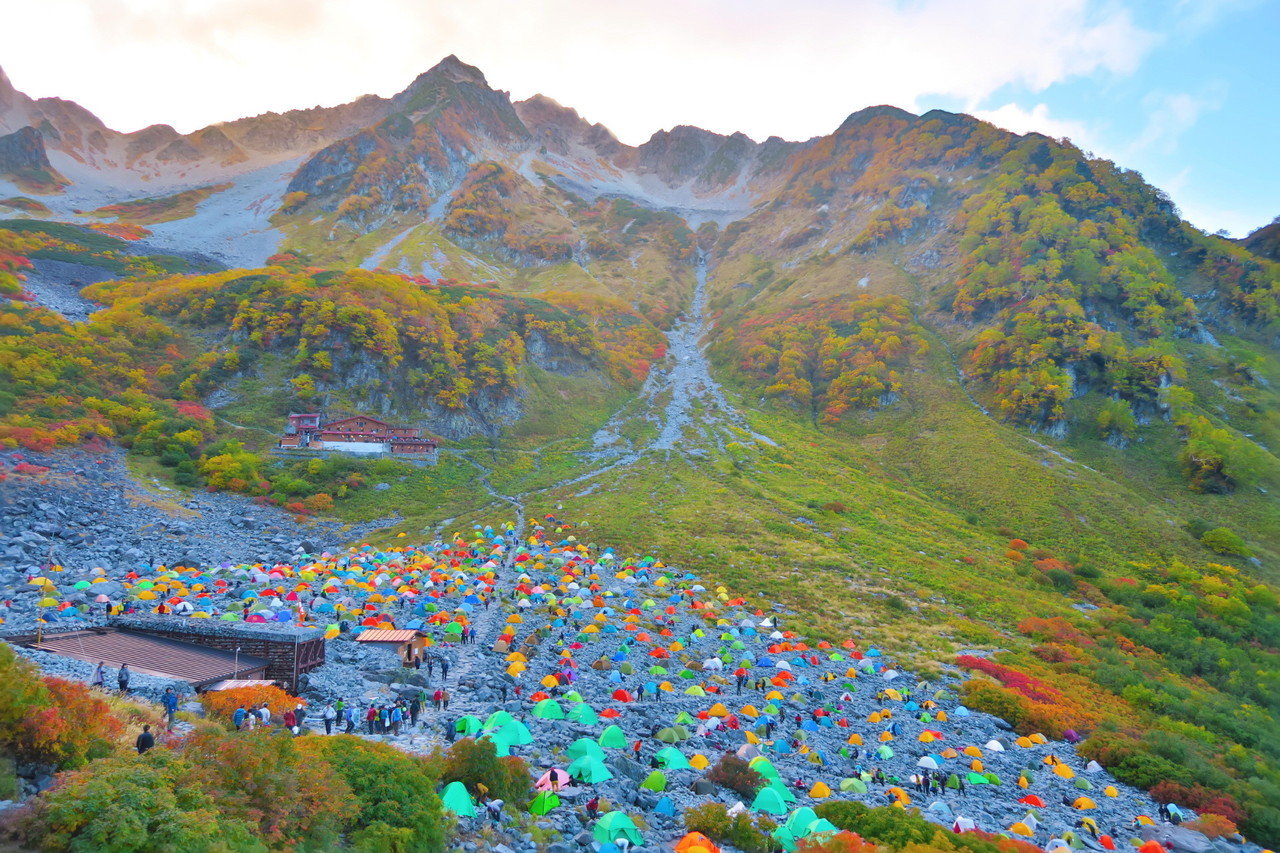 明神池、大正池、岳泽湿原等观光景点在秋季格外动人,游客络绎不绝。但是其中最有名的景点还是穗高连峰环抱的涸泽圈谷。涸泽圈谷是一处受冰川侵蚀而形成的巨大碗状洼地。每到秋季,这里的斜坡上的植被都会迸发出满眼醉人的秋色。涸泽圈谷距河童桥有 6 小时路程,所以您可能需要野营或者山中小屋留宿一晚,不过当您置身于这如梦如幻的山中美景时,一切的车马劳顿就会立时烟消云散。