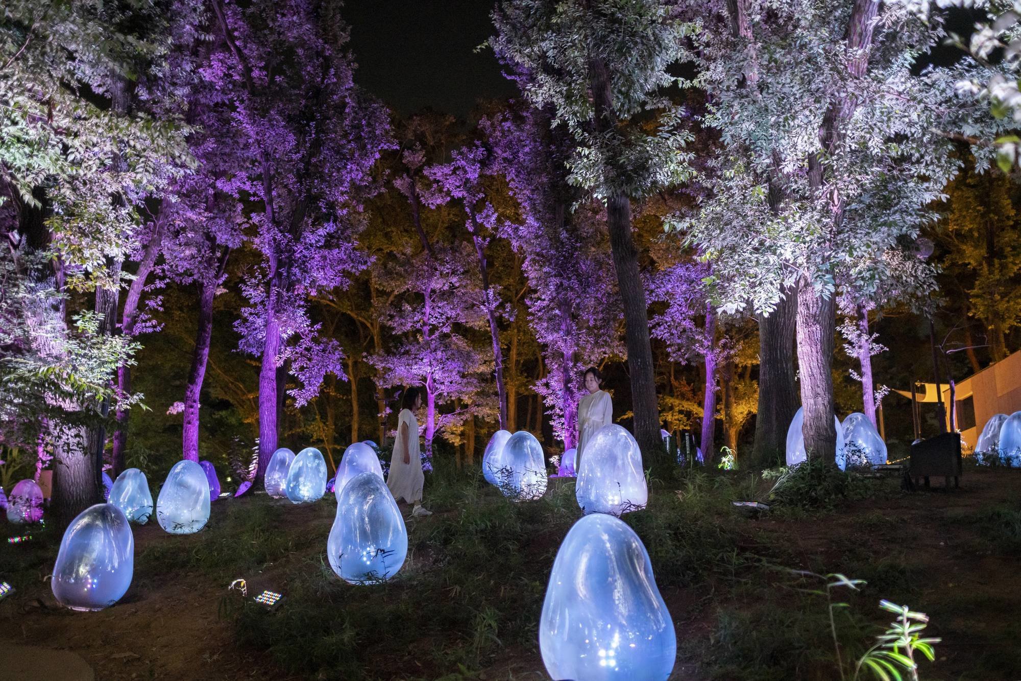 武藏野森林公园主建筑群的不远处陈列着艺术团体 teamLab 创作的永久户外展览 teamLab:《橡子森林中的生命共鸣》。