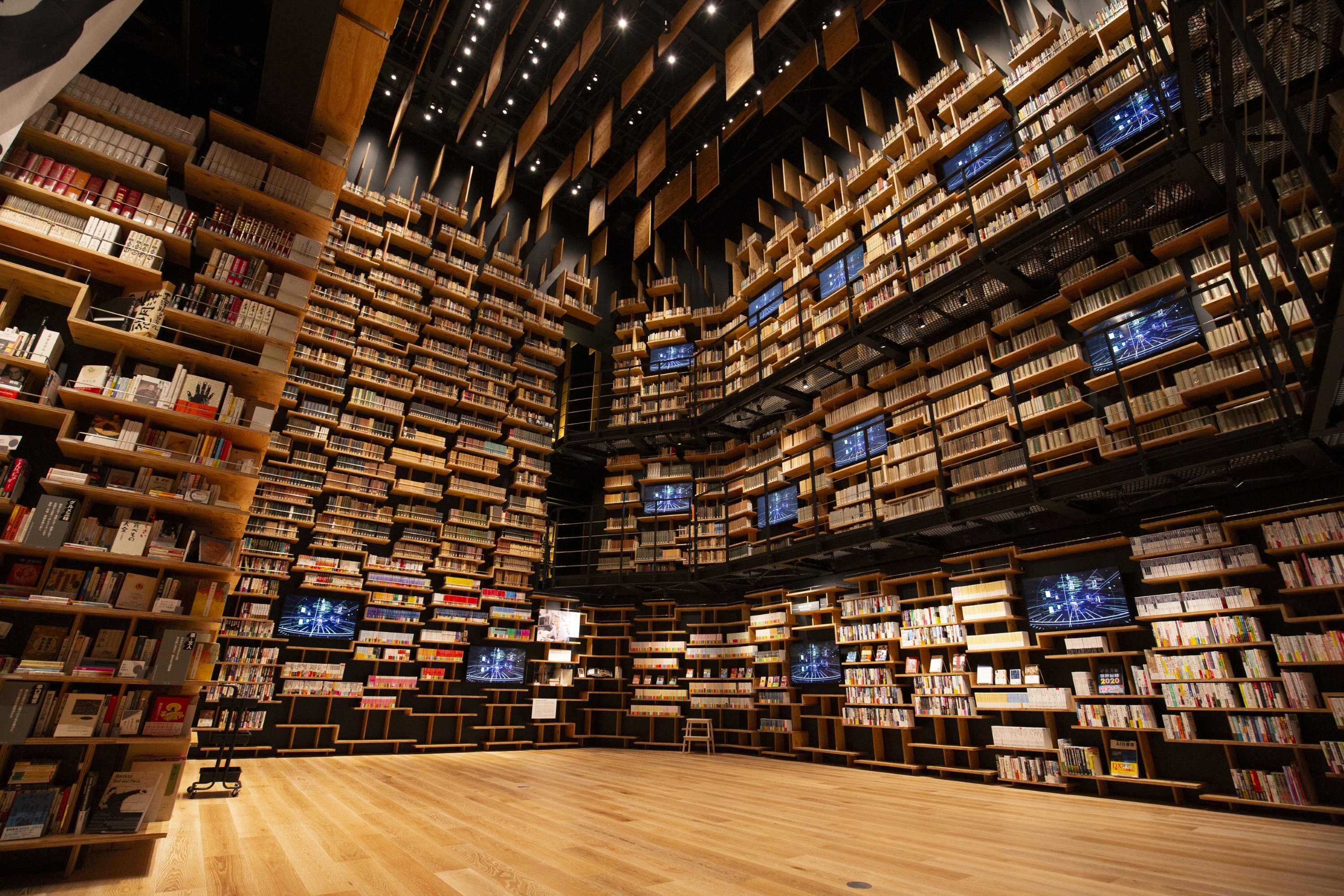 角川武藏野博物馆最大的亮点莫过于其书架剧场(本棚剧场)。中庭高达 10 米的图书馆绝对让您叹为观止。在这个壮光且迷人的空间中,藏书约有 3 万册,当然它的意义远不止是一个图书馆那么简单,还可以转变为音乐和戏剧活动的演出场地,以及视听、投影映射活动的舞台。