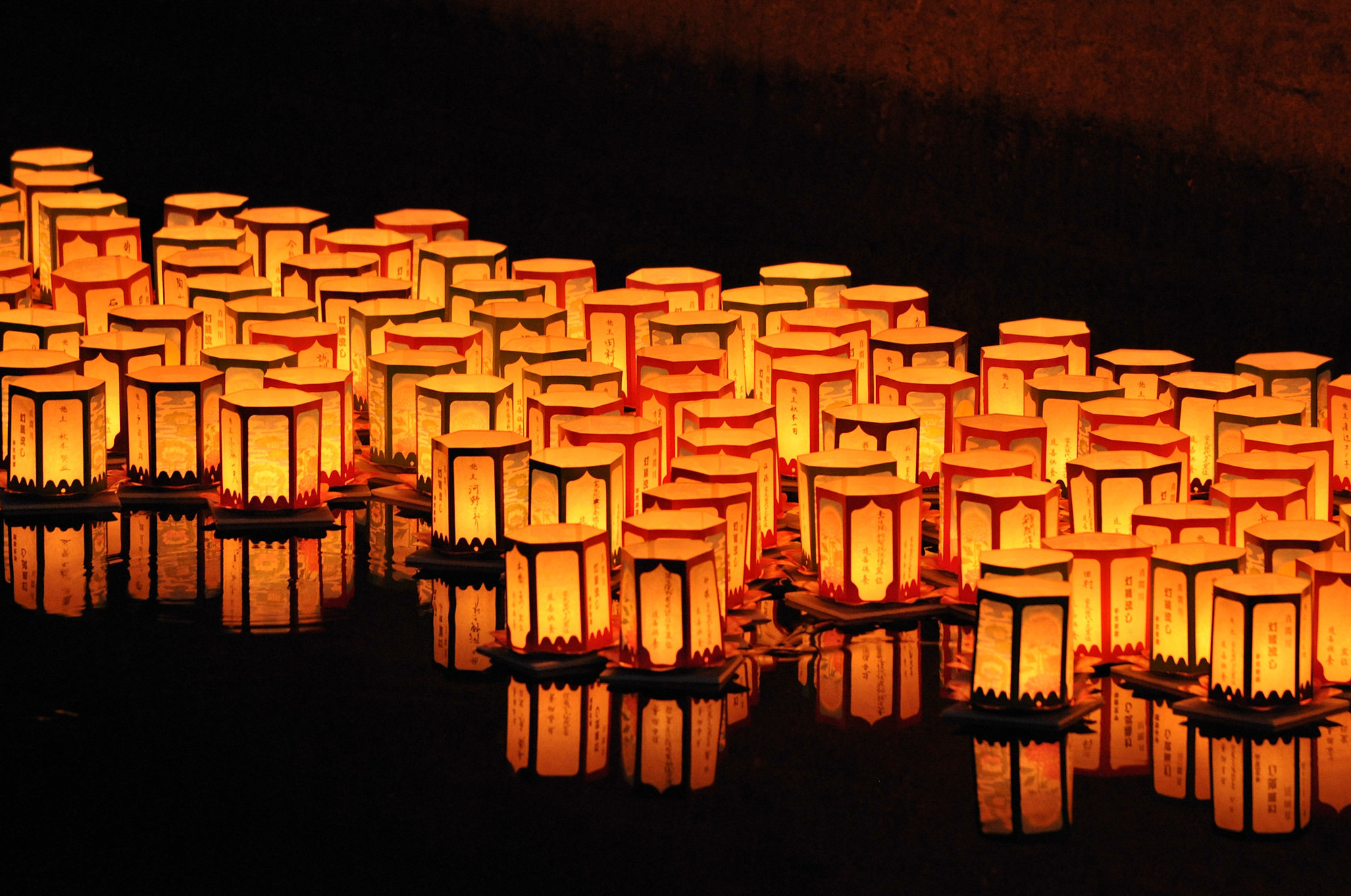 在盂兰盆节,放水灯是一种纪念祖先的常见仪式。