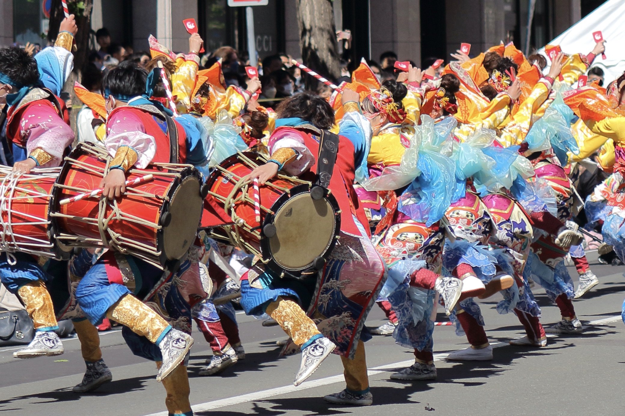 舞者们随着传统木制乐器“鸣子”的节拍翩翩起舞,同时,配有扬声器和工作人员的卡车会用歌声和呐喊为舞者们助威,将气氛推向更高潮,使这场盛事气氛更加热烈。这些游行卡车的装饰与一旁舞者们的衣着颜色相映成趣,构建出一幅宏大而和谐的节日画卷,让参与者沉浸在浓厚的节日氛围中。