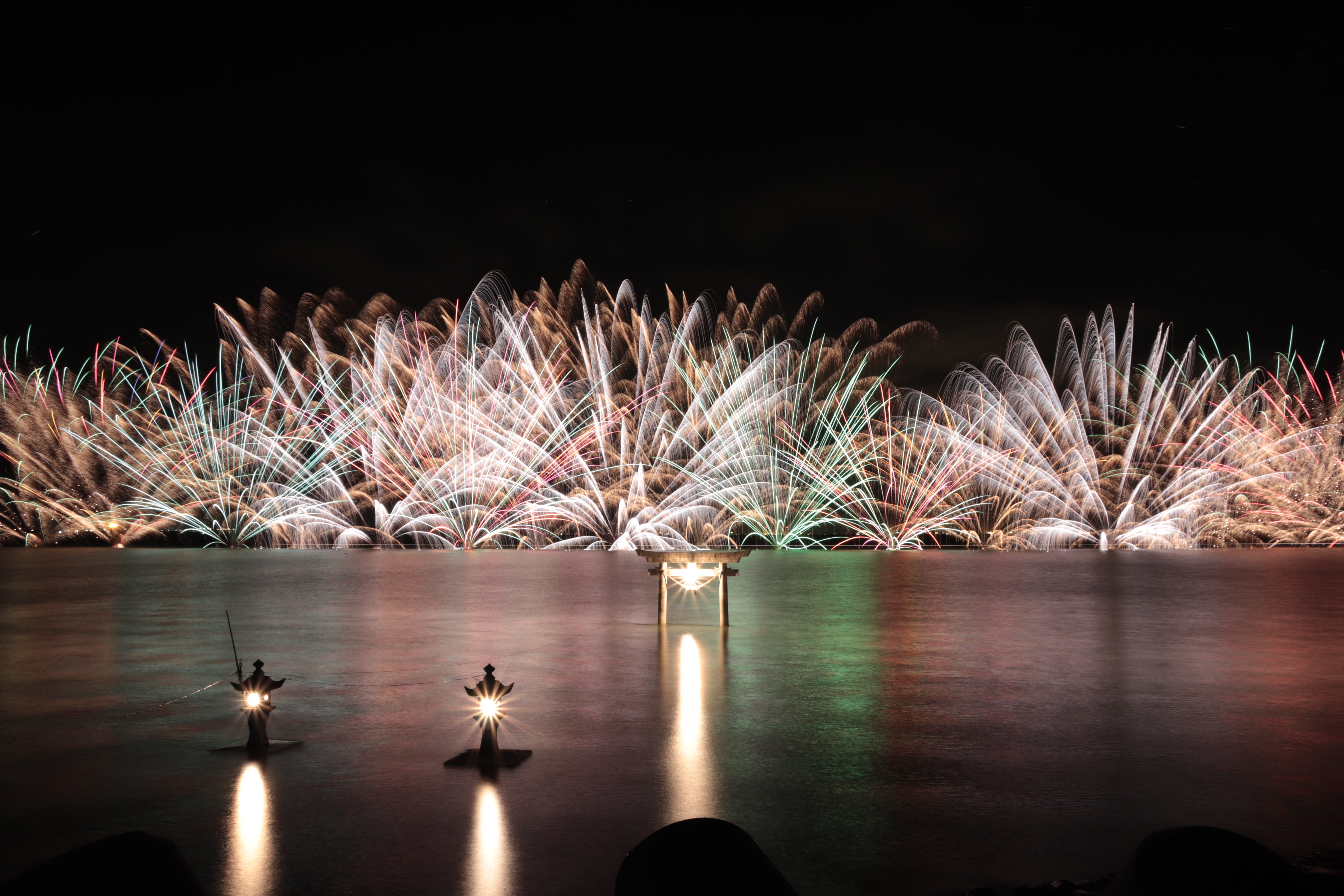 夜幕降临,町长和身着景行天皇装束的艺人会乘船前往永尾剱神社的海中鸟居门,准备将烟花射向海面。穿着精致服饰的参与者们会手执松明前来迎船,并把船上的人送到主会场。待璀璨绚丽的烟花在水面上绽放,祭典的气氛也随之被推向最高潮。